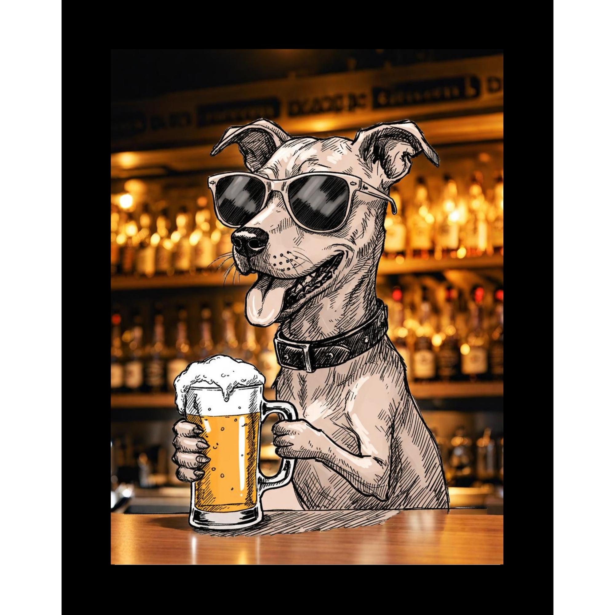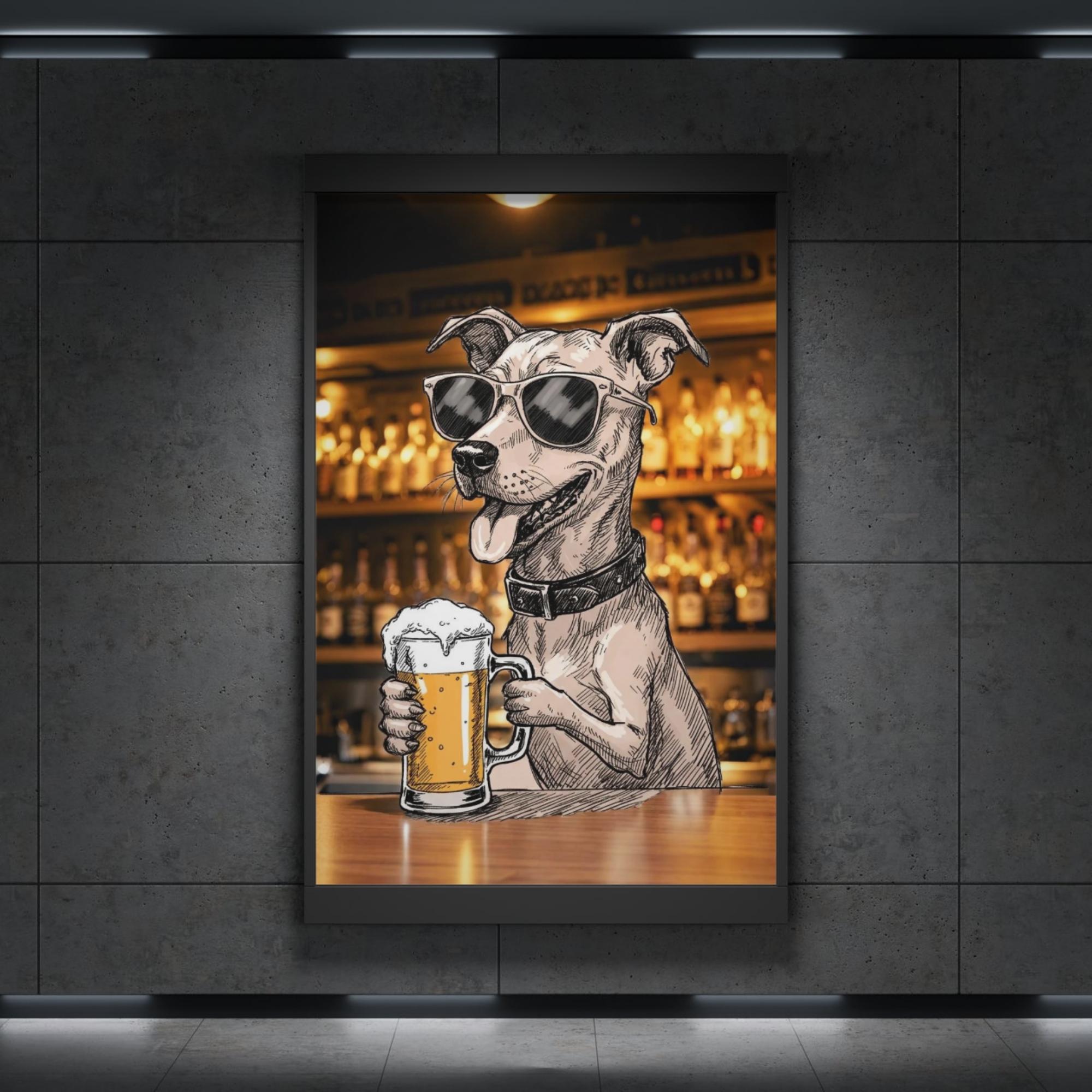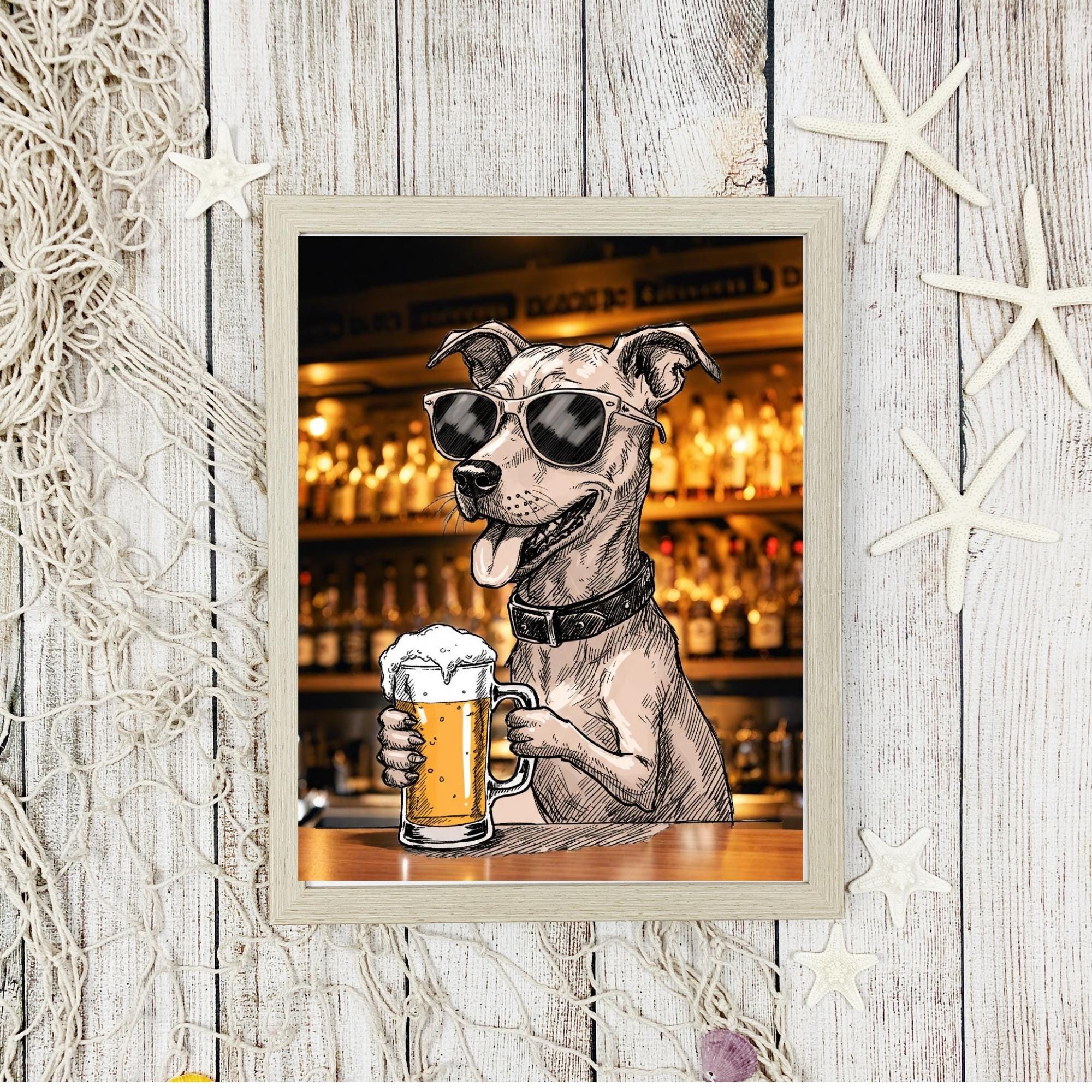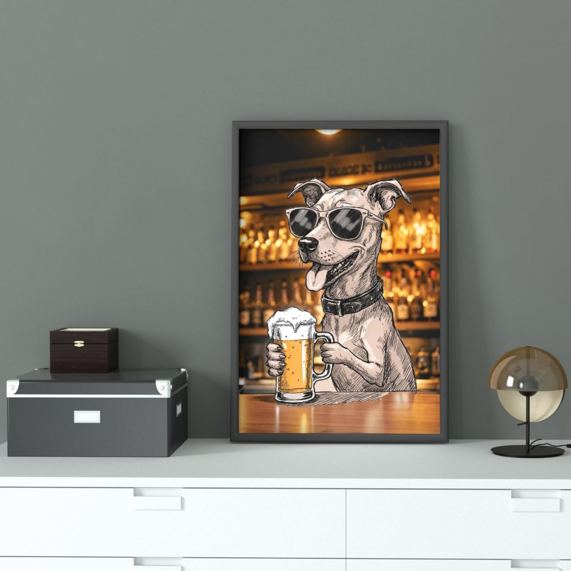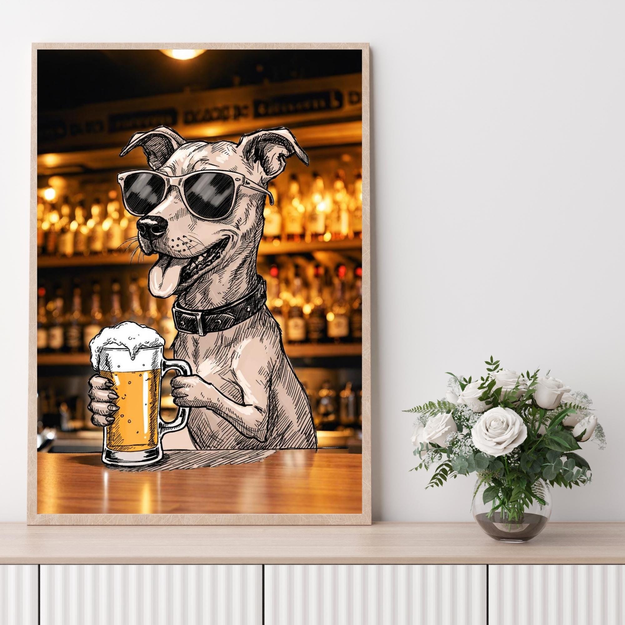 Add character and humor to any room with this unique and fun digital wall art!Dog in Sunglasses Art Print: Funny Beer Drinking Pet Portrait This illustration features a charismatic dog wearing cool sunglasses and enjoying a large, frothy glass of beer. Perfect for a bar, man cave, living room, or kitchen, this piece is sure to bring a smile to your guests' faces.