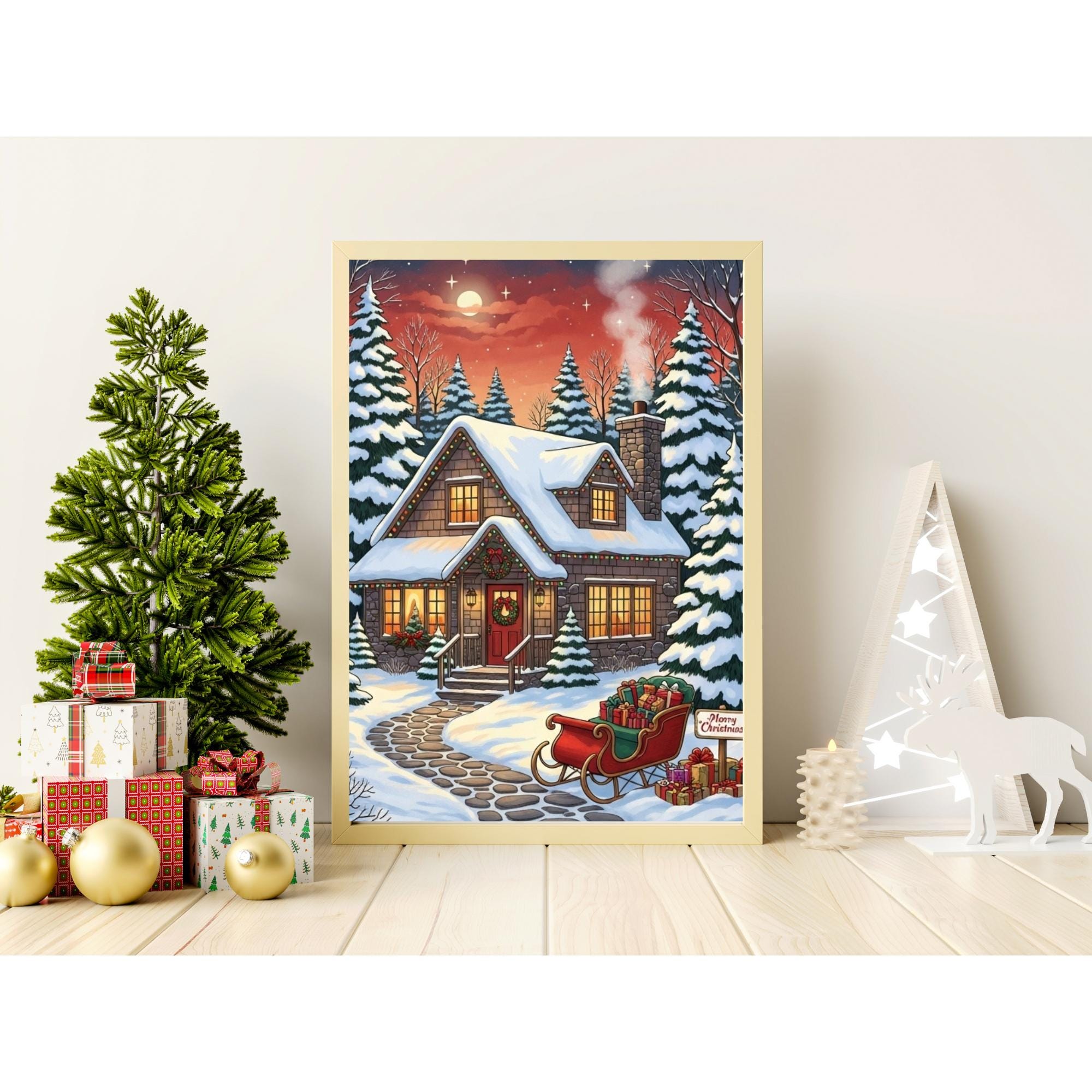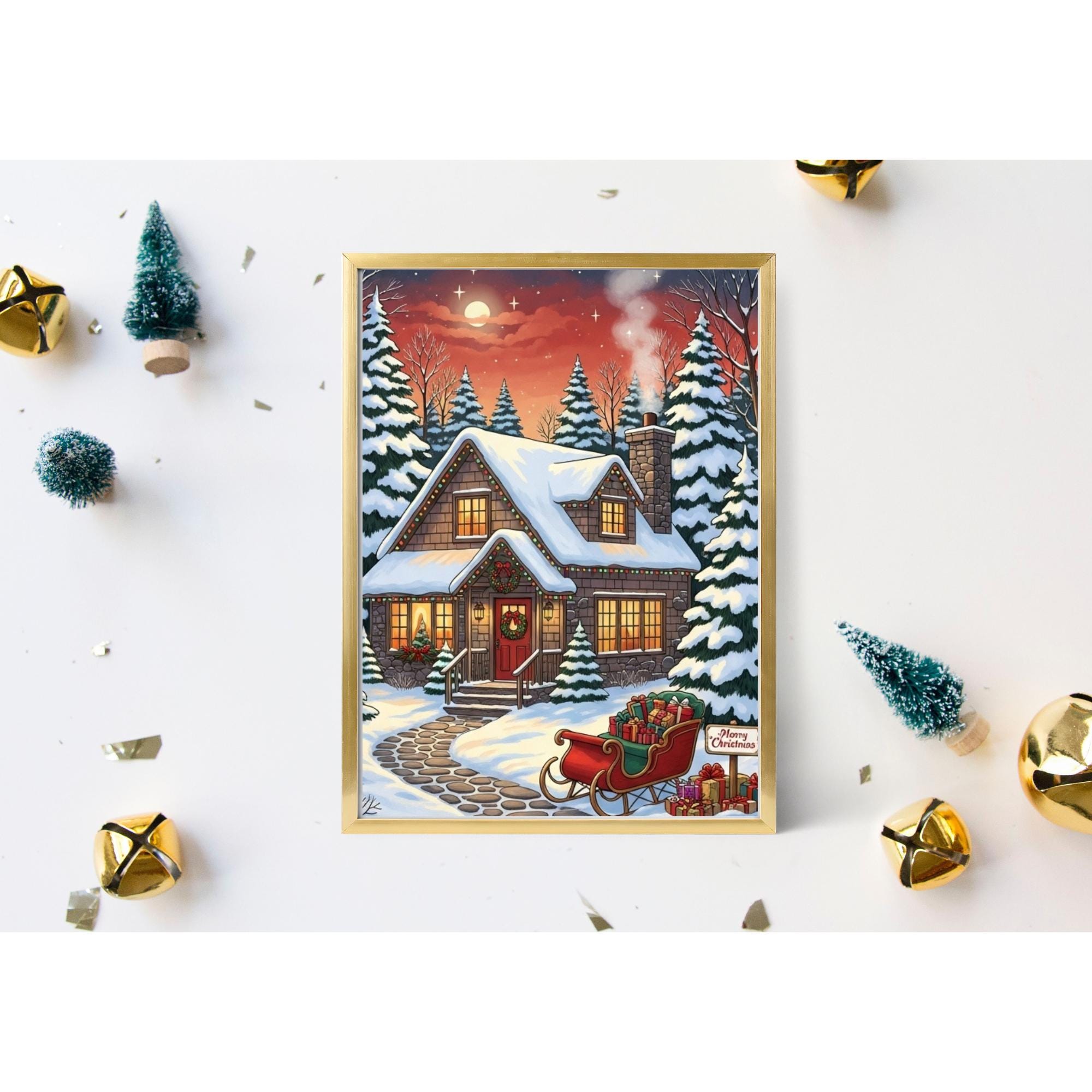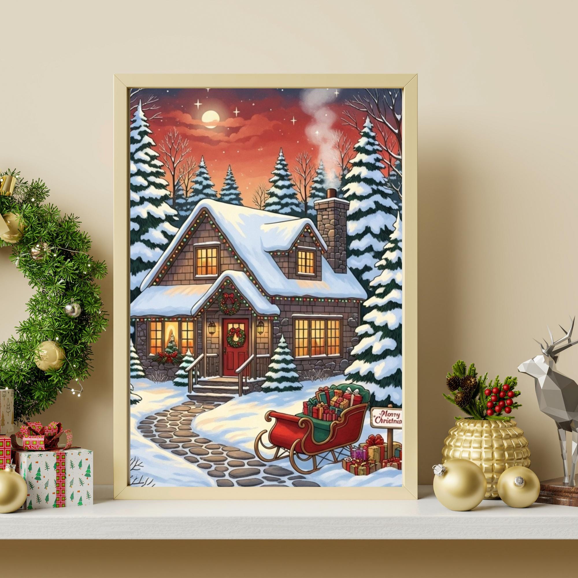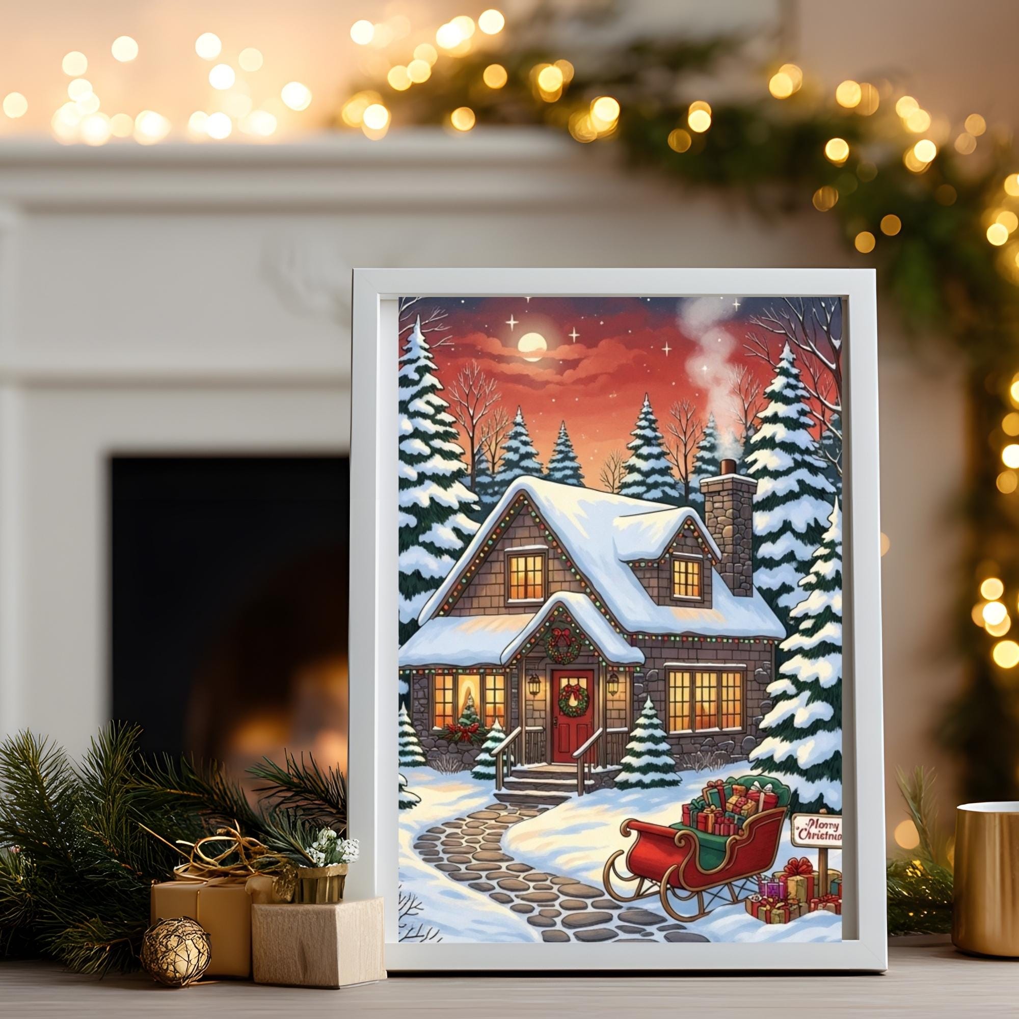 Bring the magic of the holidays into your home with this enchanting Christmas Cottage art print. This digital download captures a Cozy Christmas night, featuring a snow-covered house, festive lights, and a sleigh full of gifts under a starry sky.