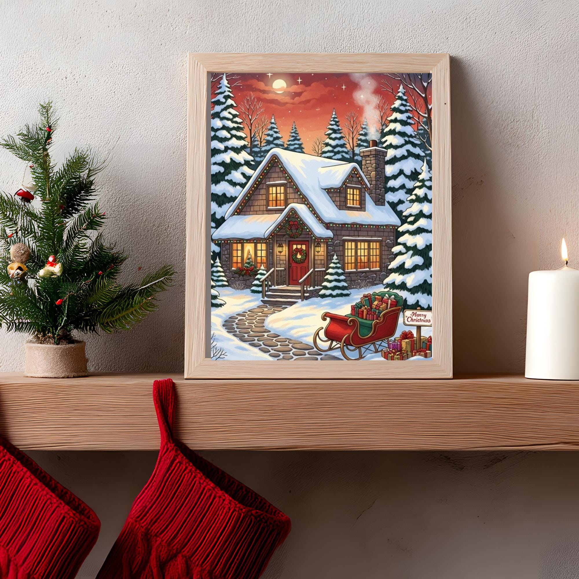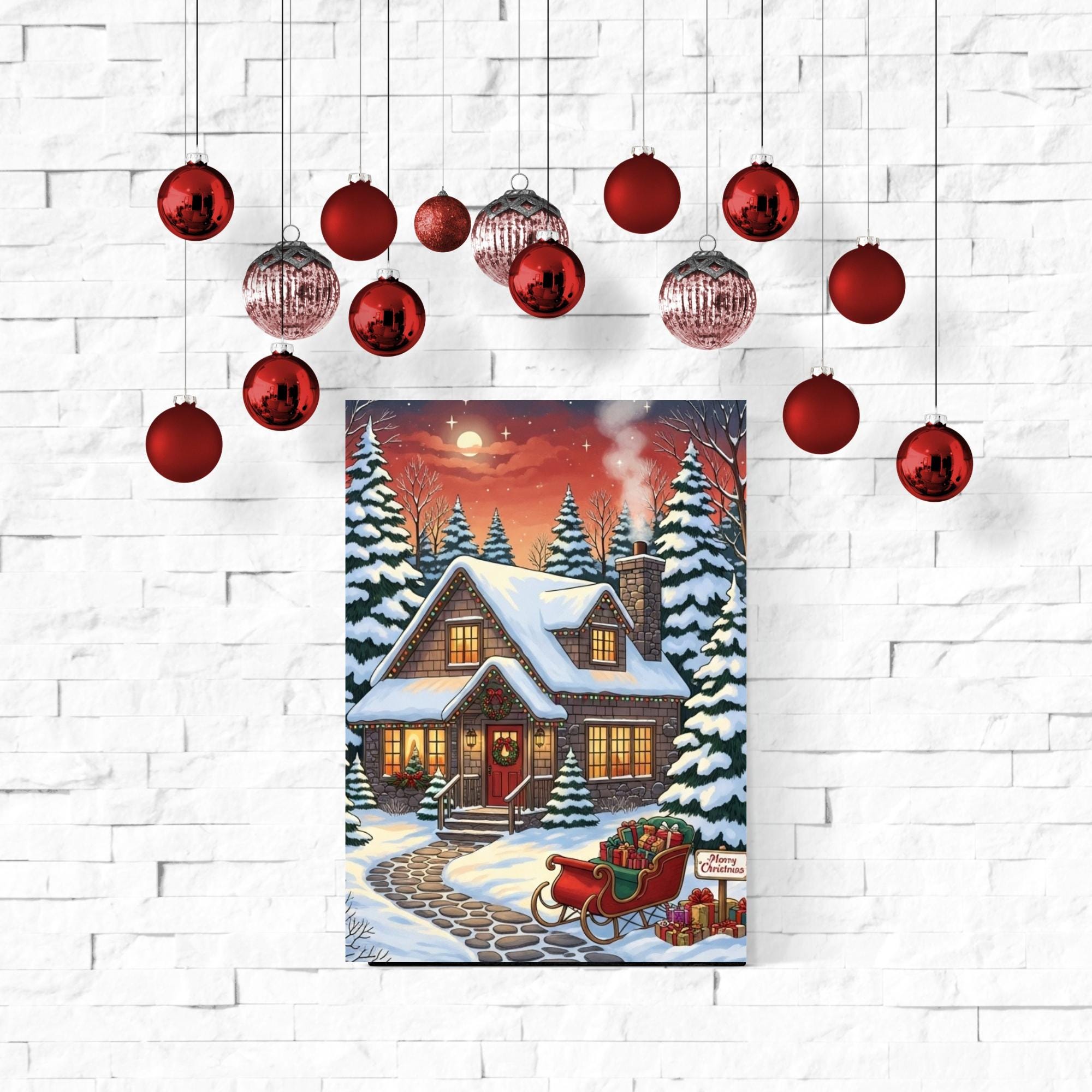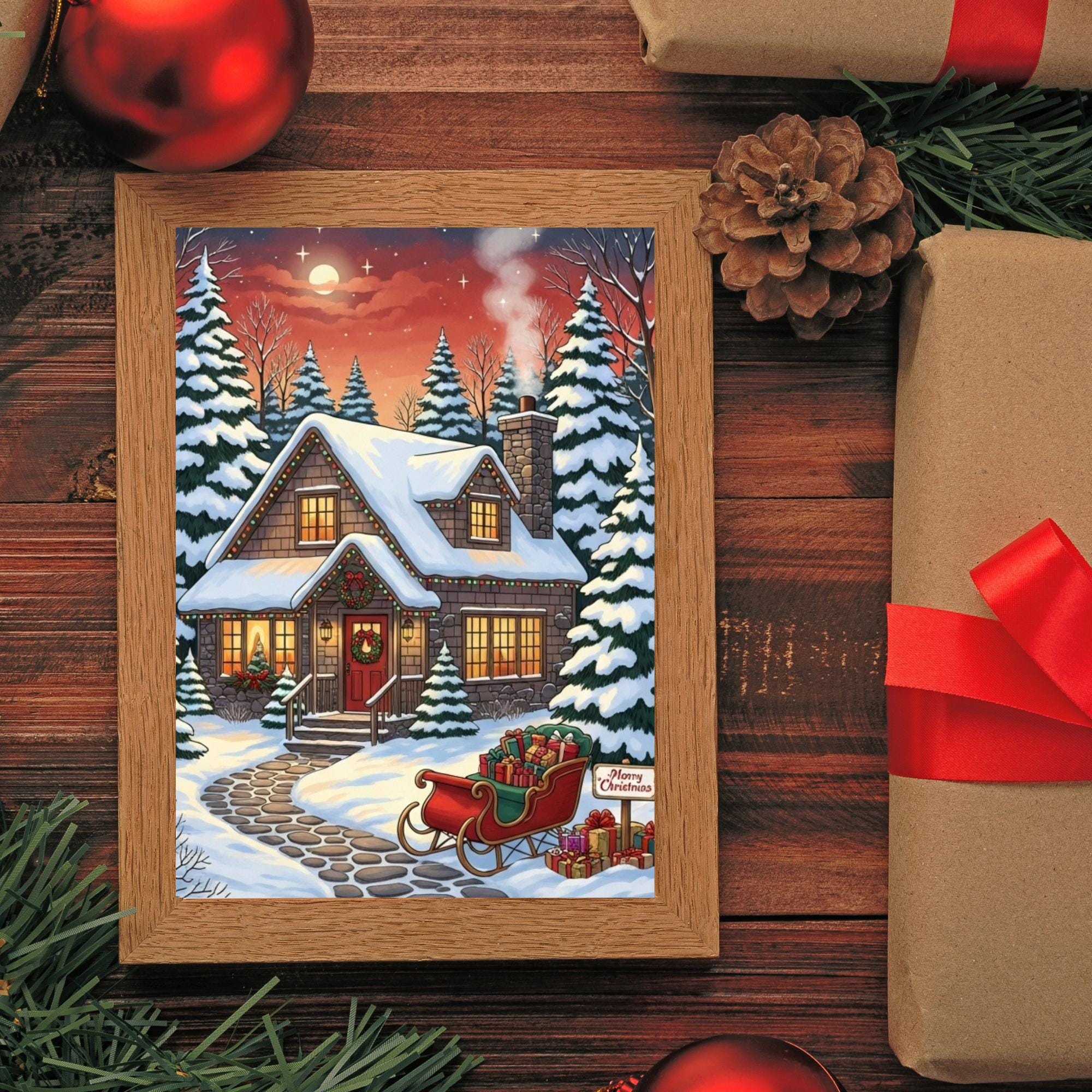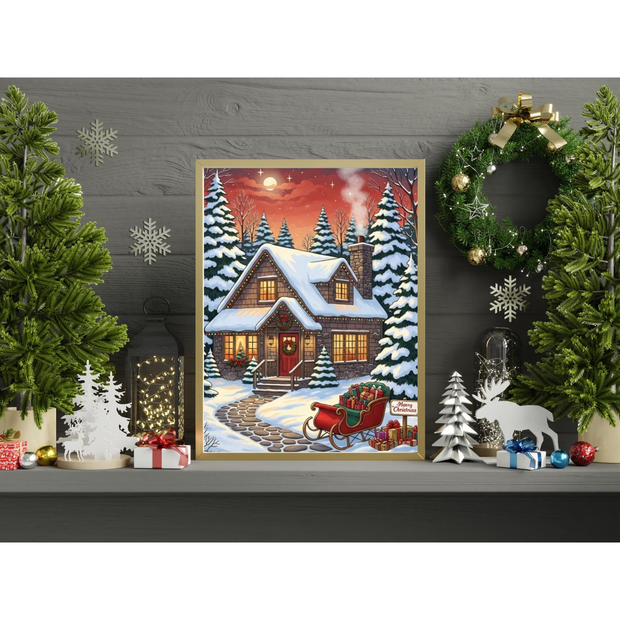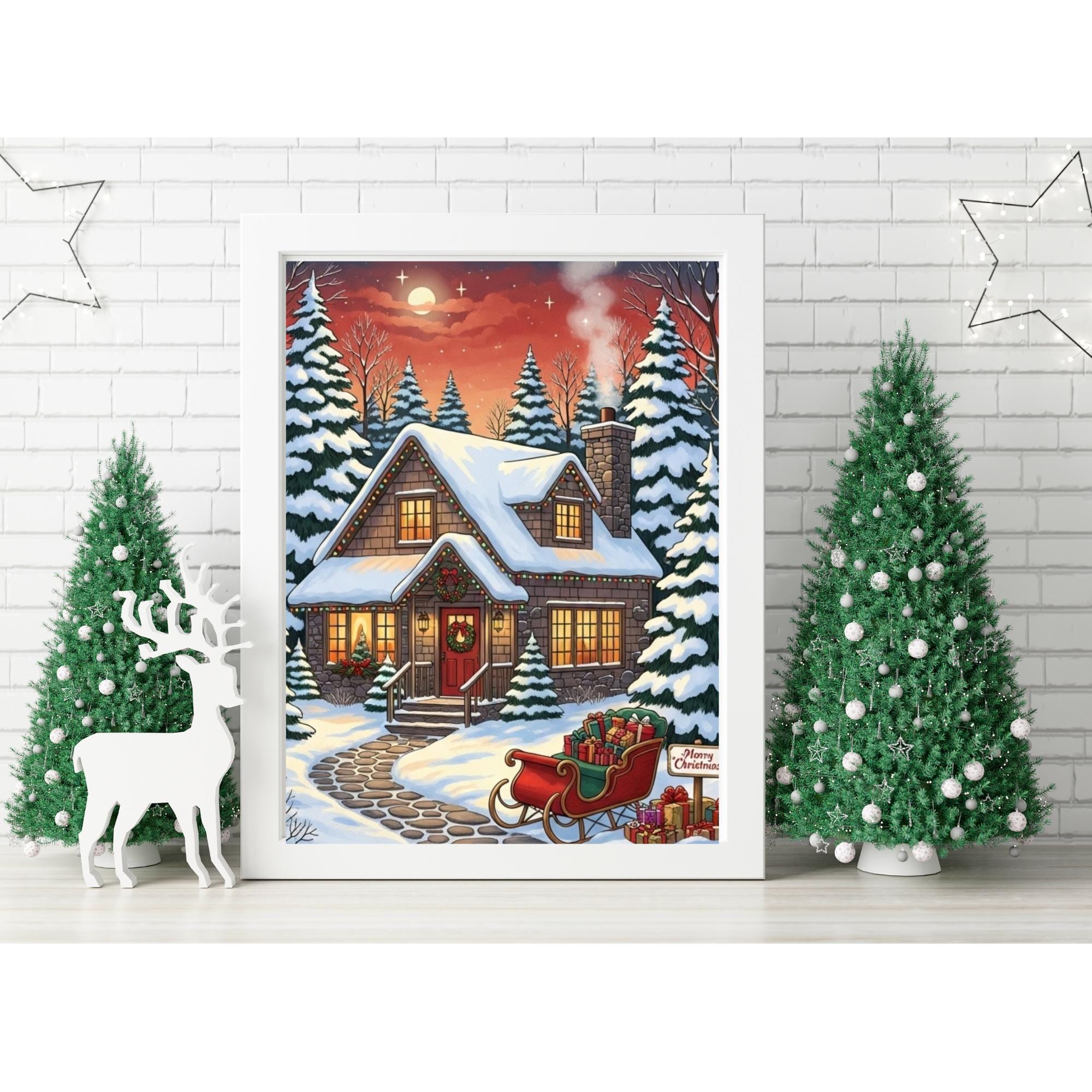 Bring the magic of the holidays into your home with this enchanting Christmas Cottage art print. This digital download captures a Cozy Christmas night, featuring a snow-covered house, festive lights, and a sleigh full of gifts under a starry sky.