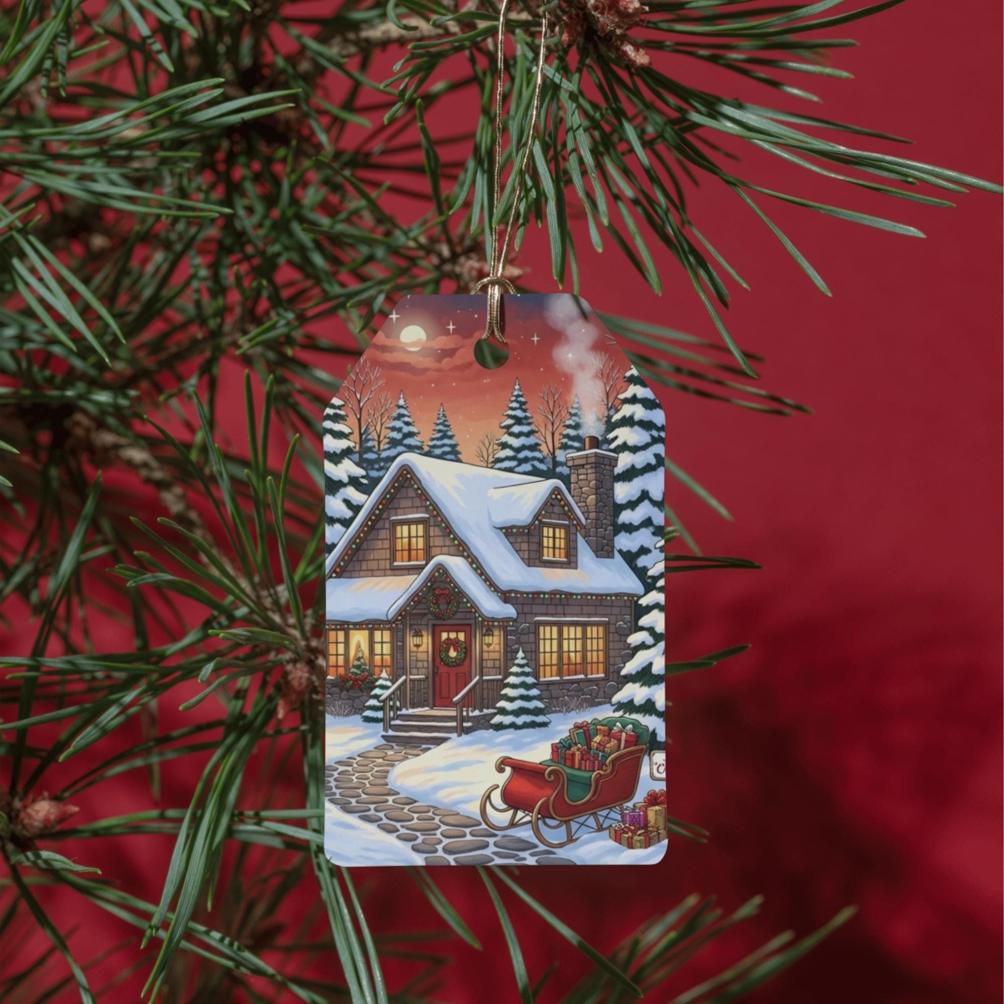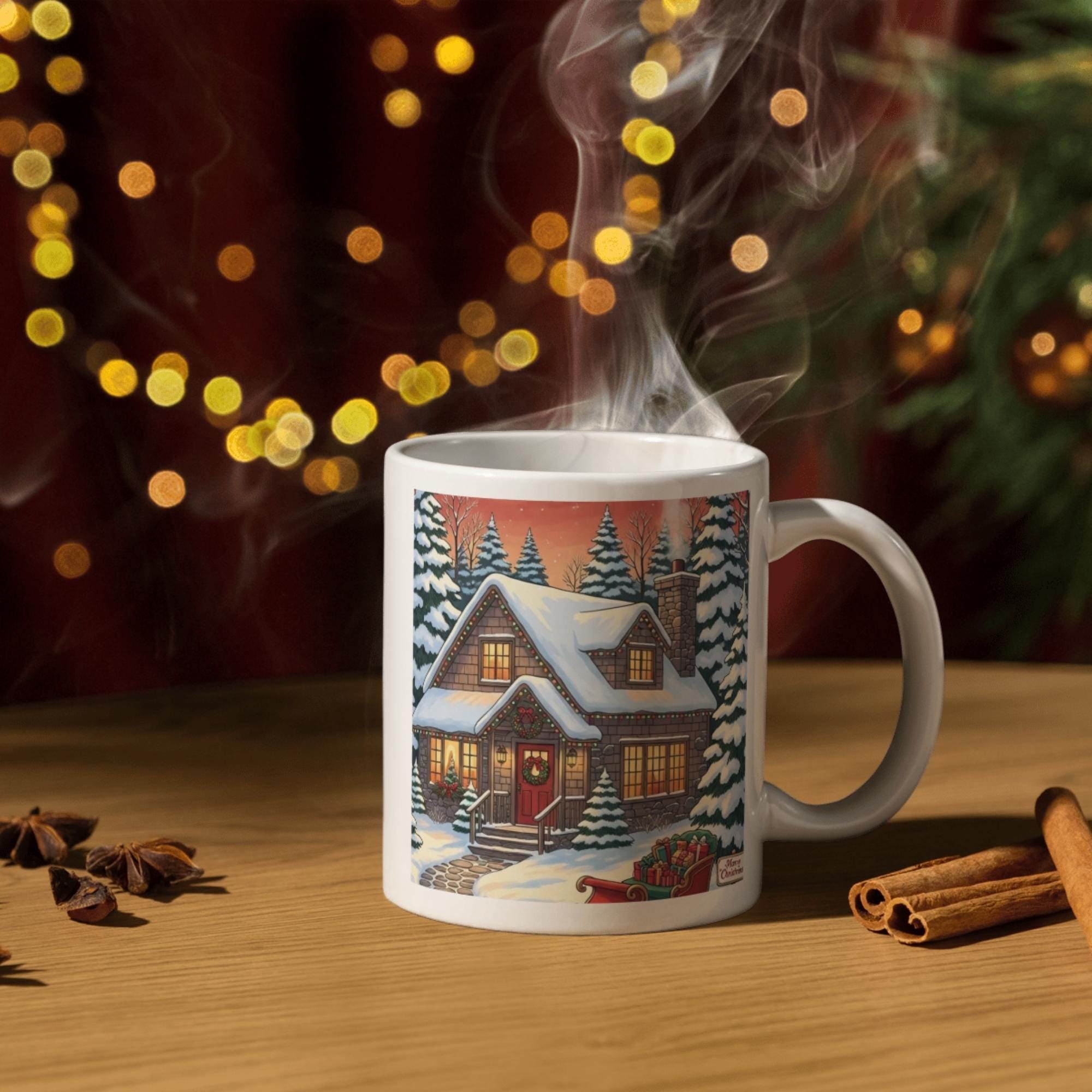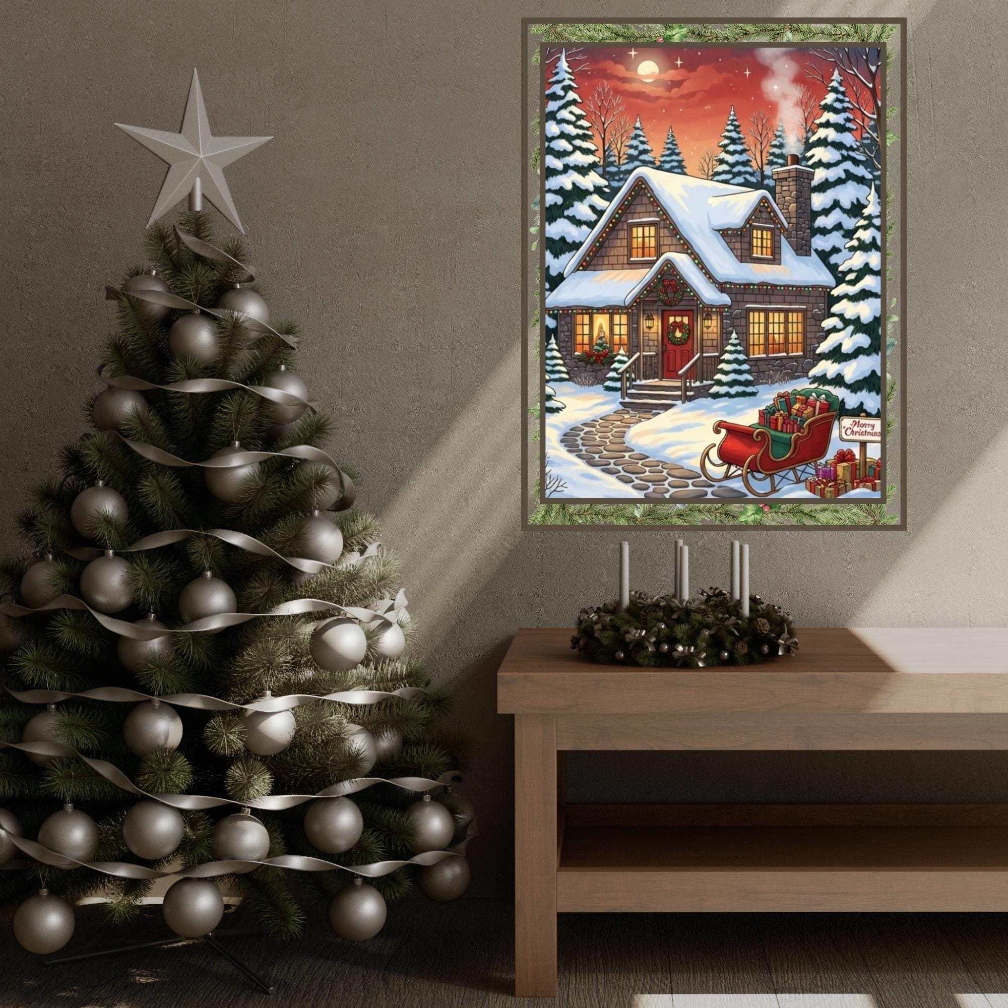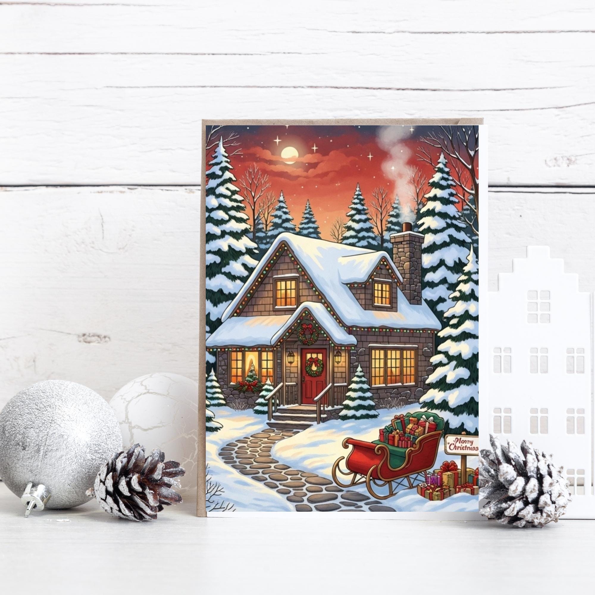 Bring the magic of the holidays into your home with this enchanting Christmas Cottage art print. This digital download captures a Cozy Christmas night, featuring a snow-covered house, festive lights, and a sleigh full of gifts under a starry sky.