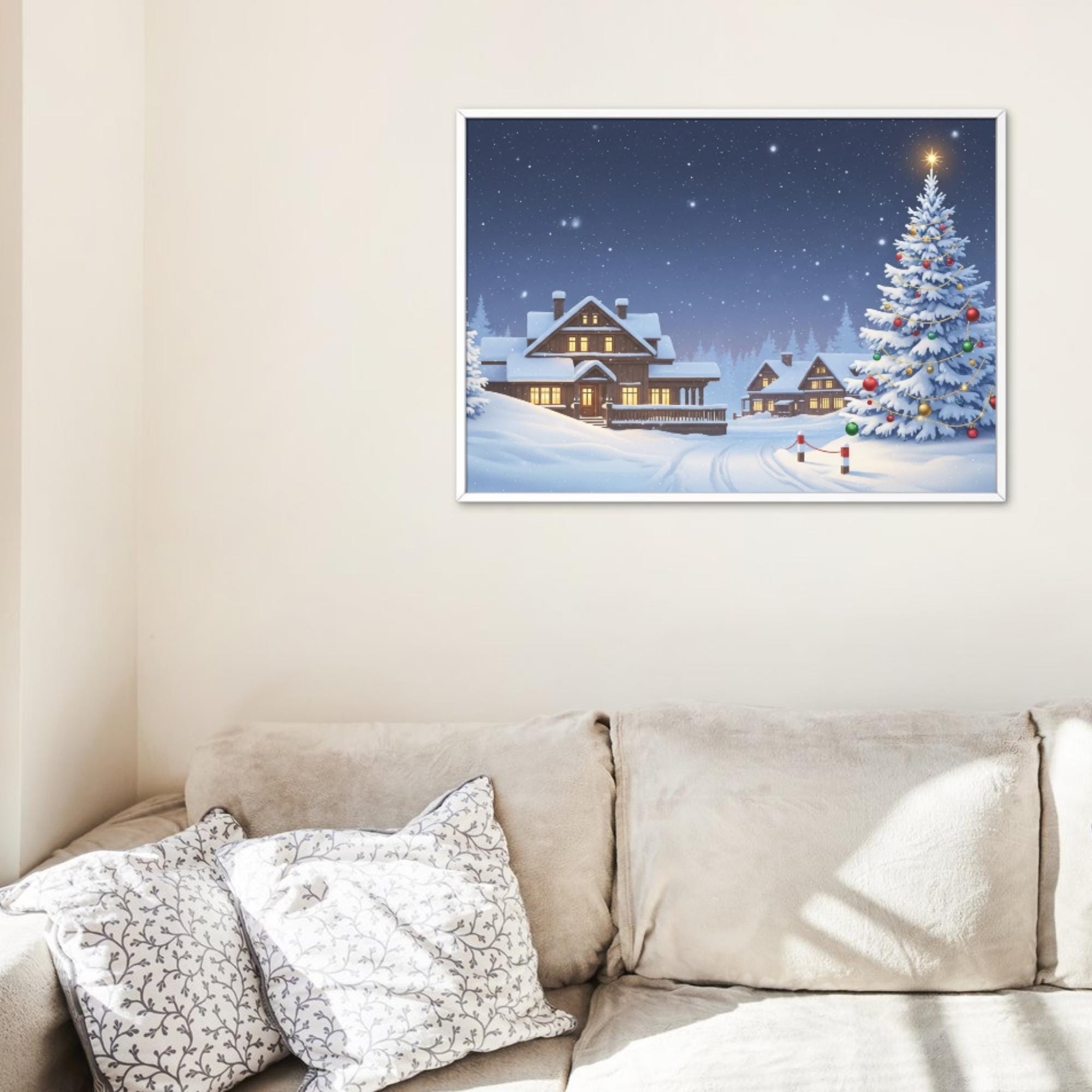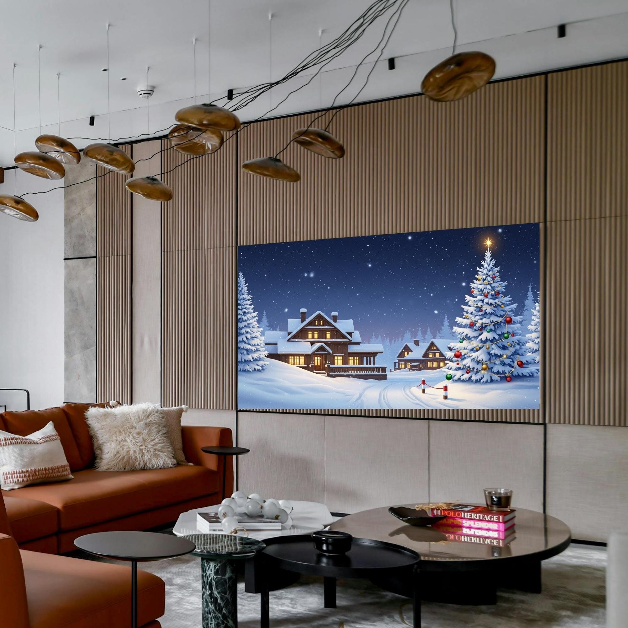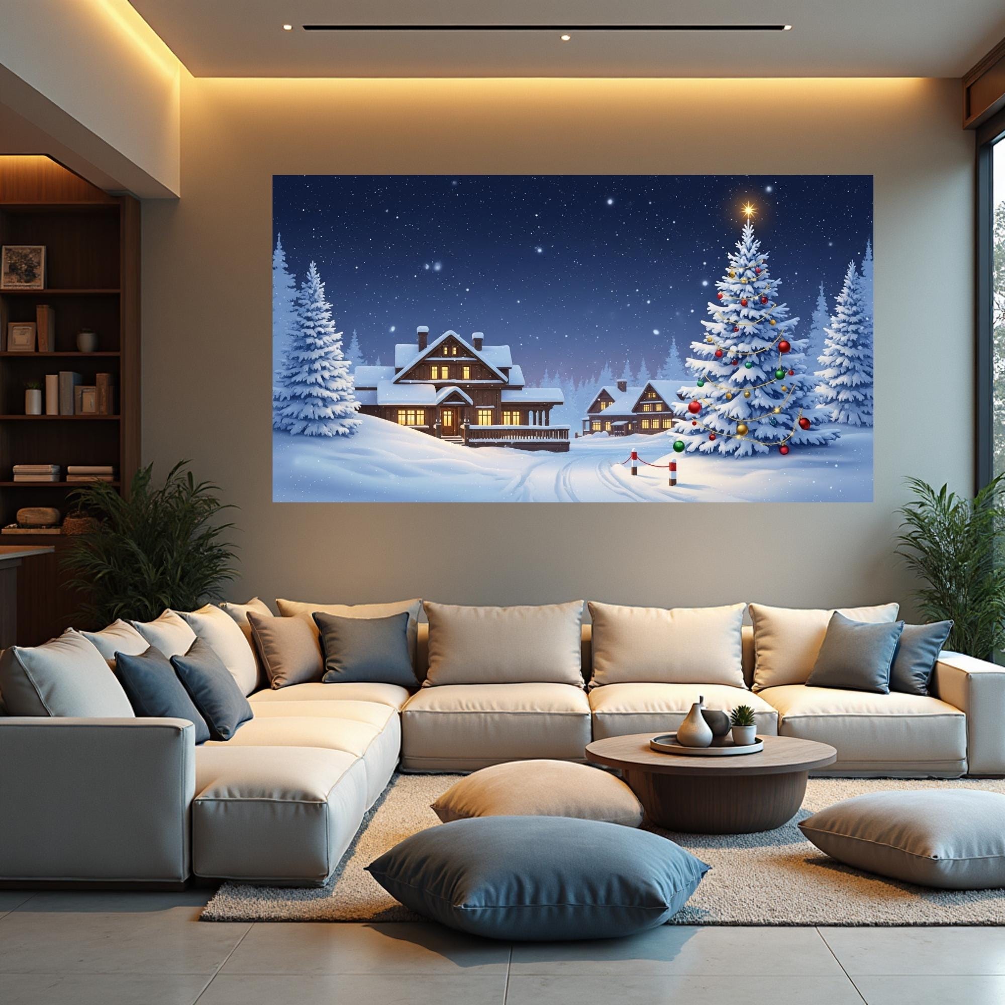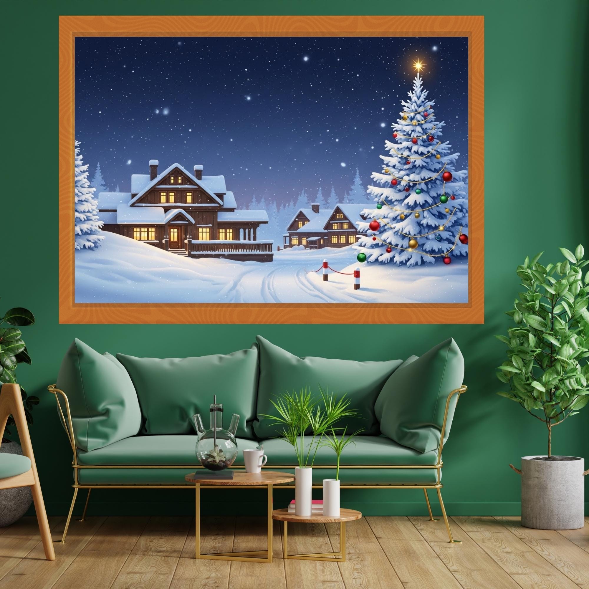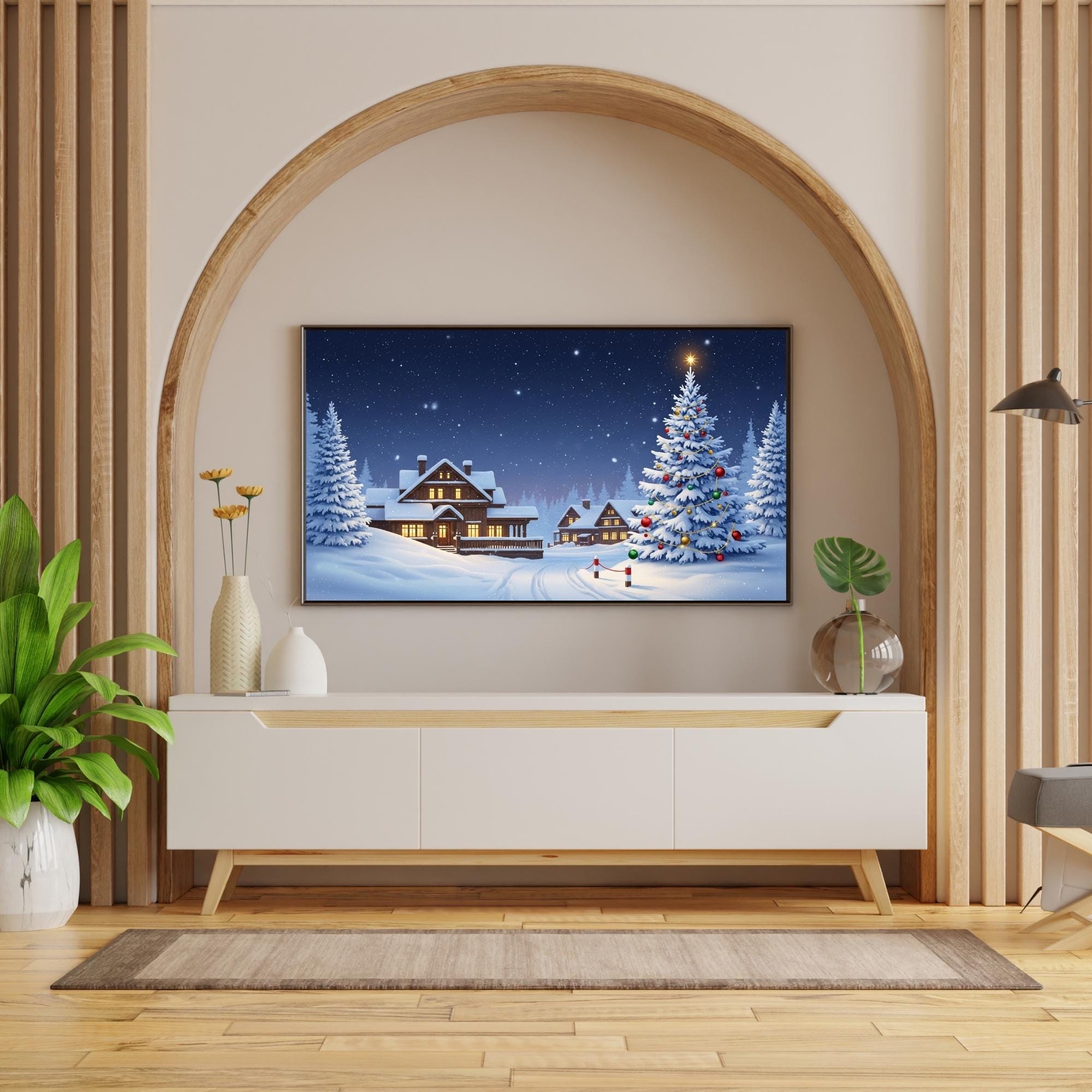Featuring a peaceful snowy cabin, glowing windows, and a beautifully decorated Christmas tree under a starry sky — this artwork brings warmth and serenity to any living room. Perfect for your Samsung Frame TV, smart display, or digital art frame!