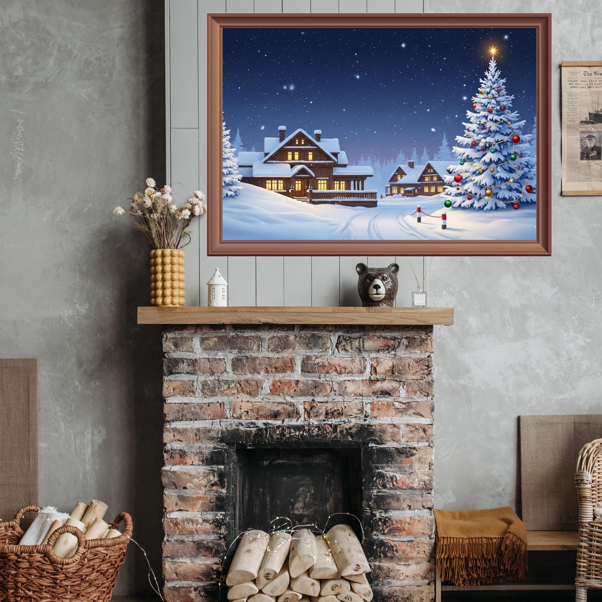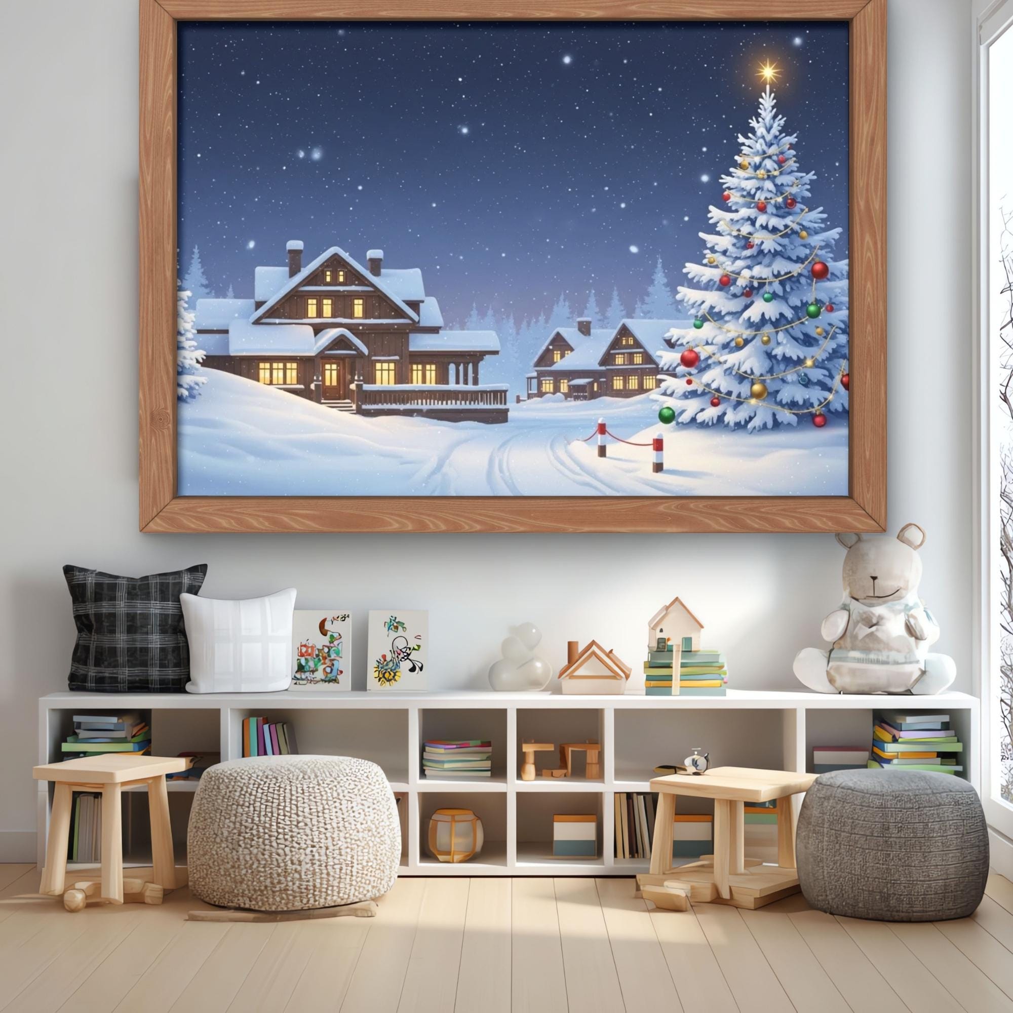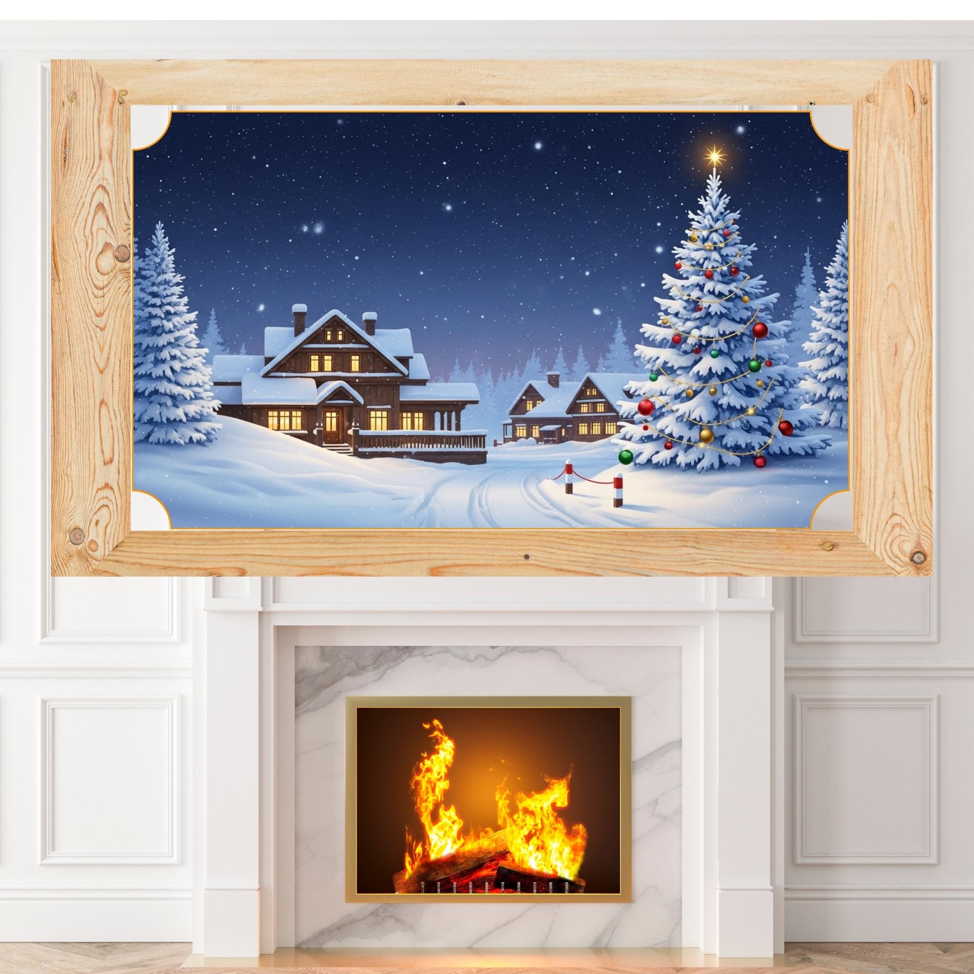Xmas Tree,Transform your home into a cozy winter wonderland with this Christmas Winter Scene Frame TV Art.Christmas Cabin Frame TV Art,