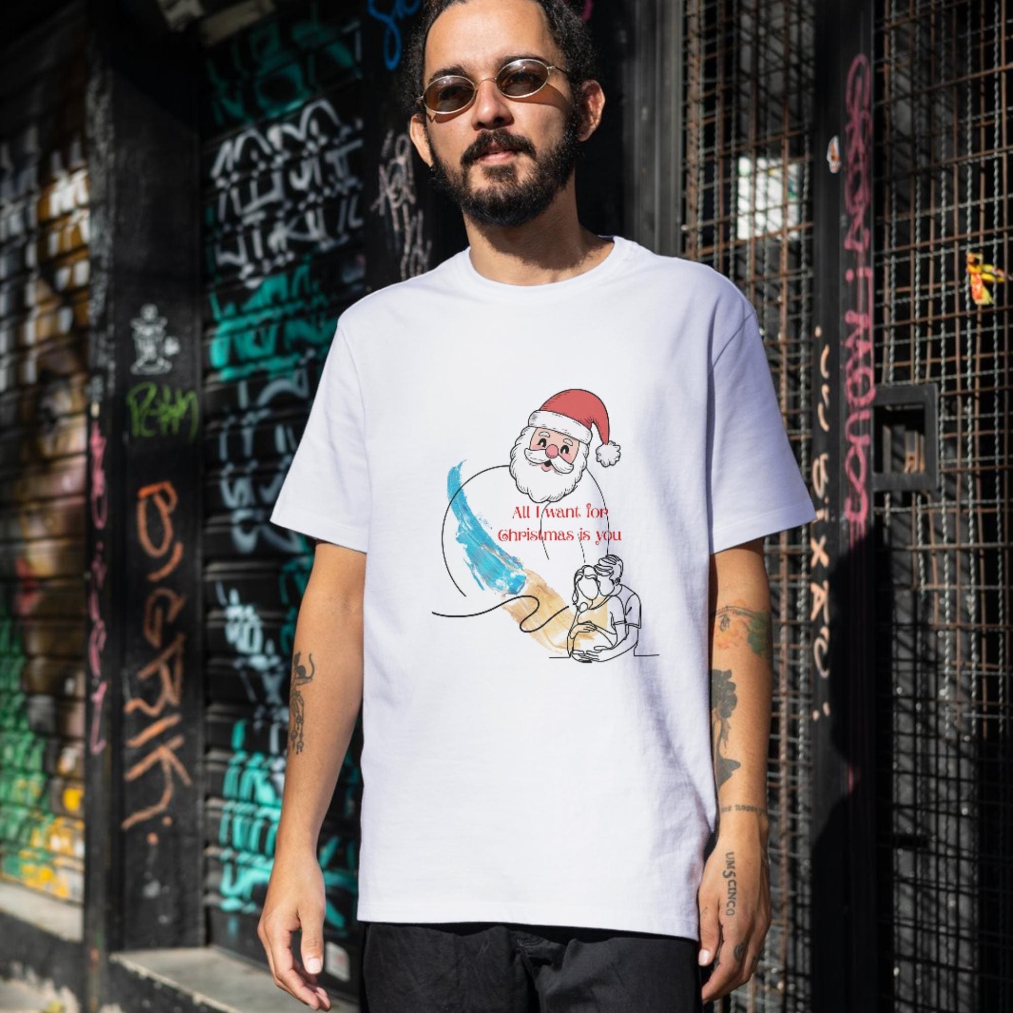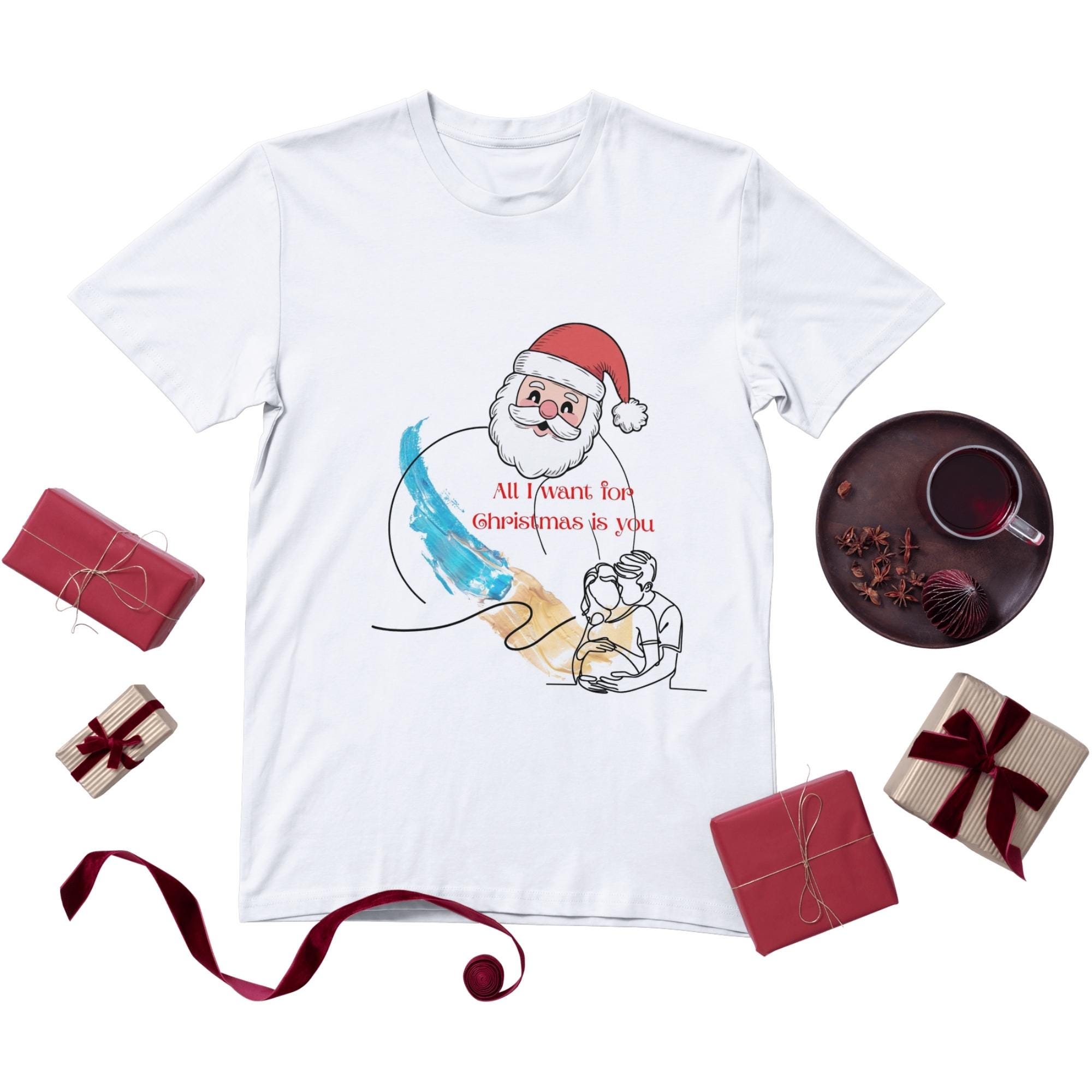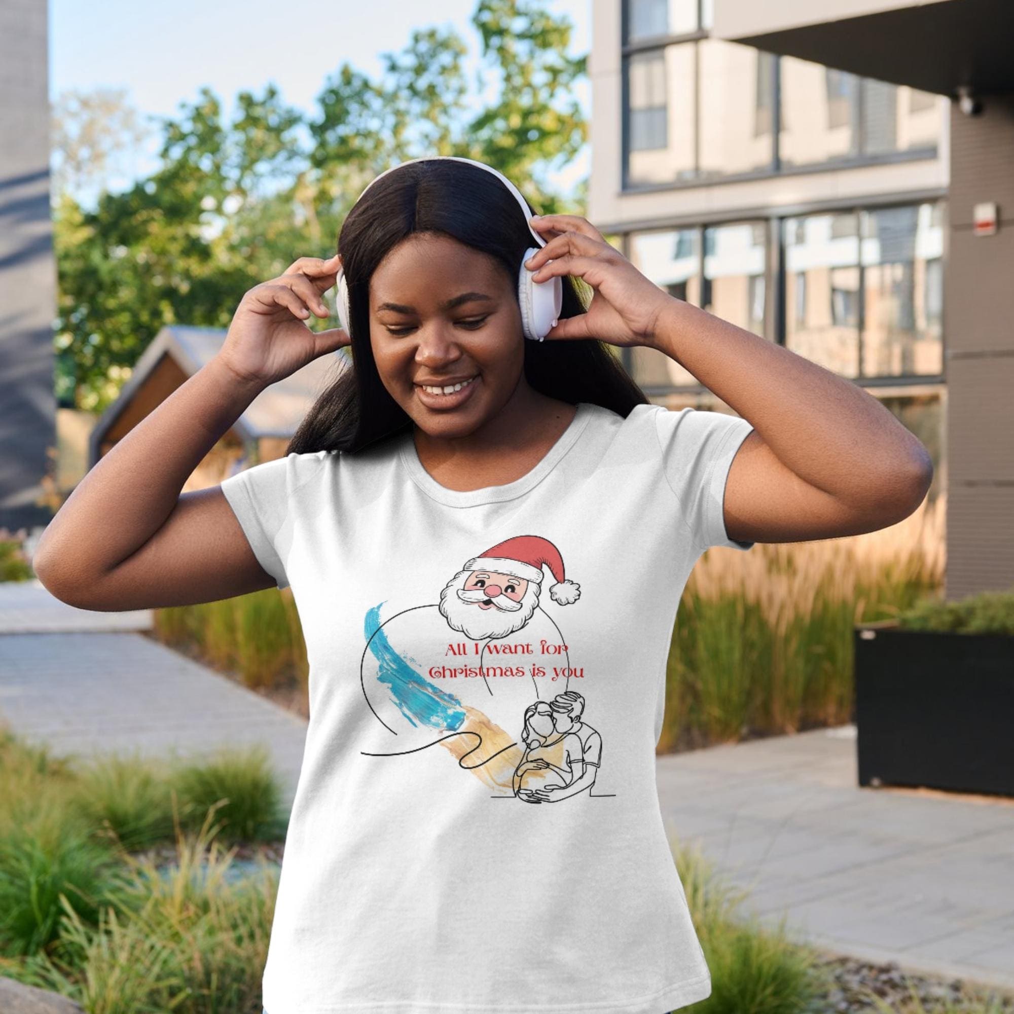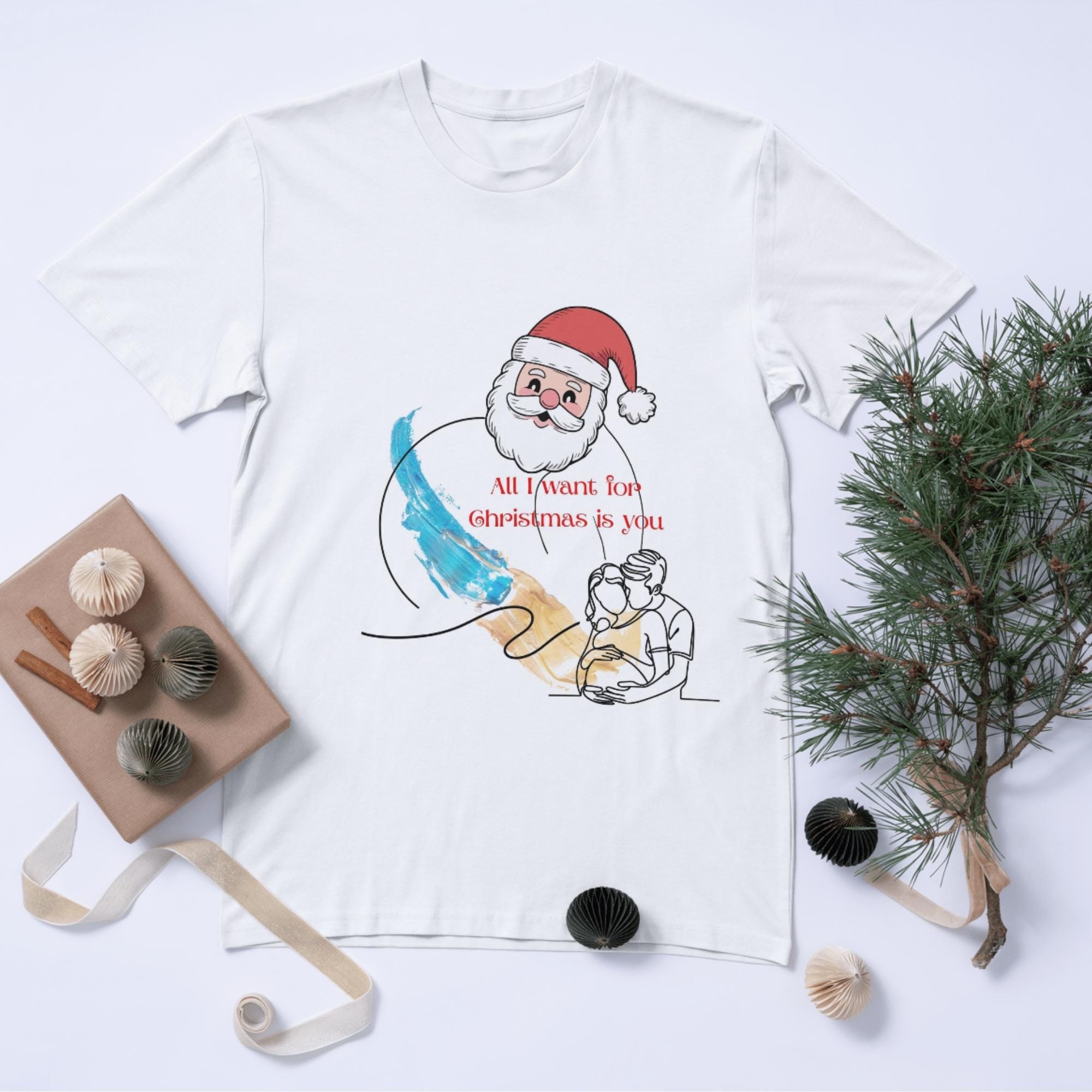 the magic of the season with this adorable “All I Want for Christmas Is You” design featuring a sweet pregnant couple, modern line-art style, soft paint strokes, and a cute Santa illustration.