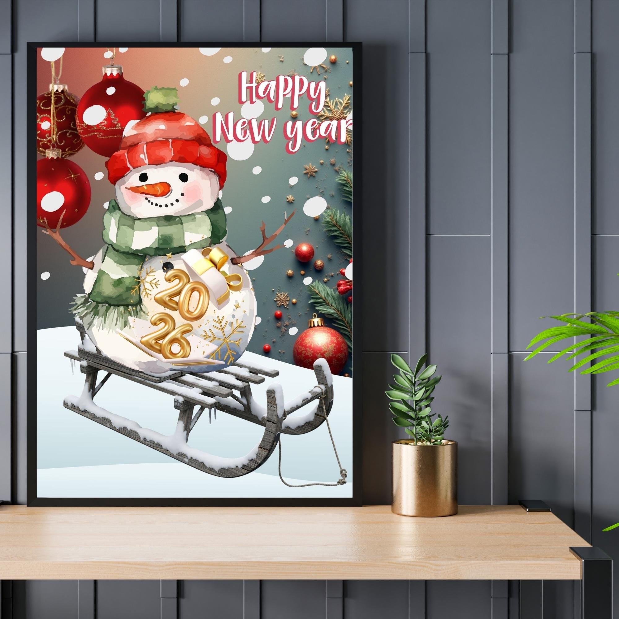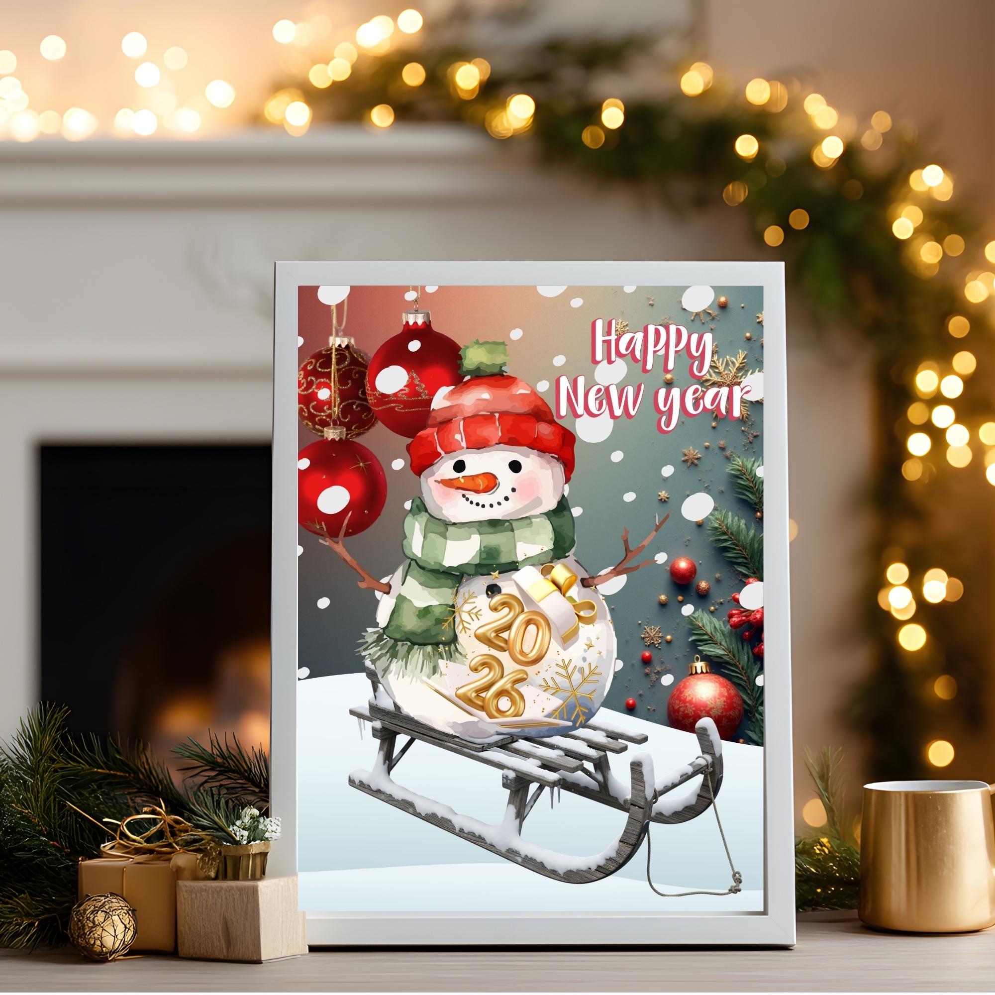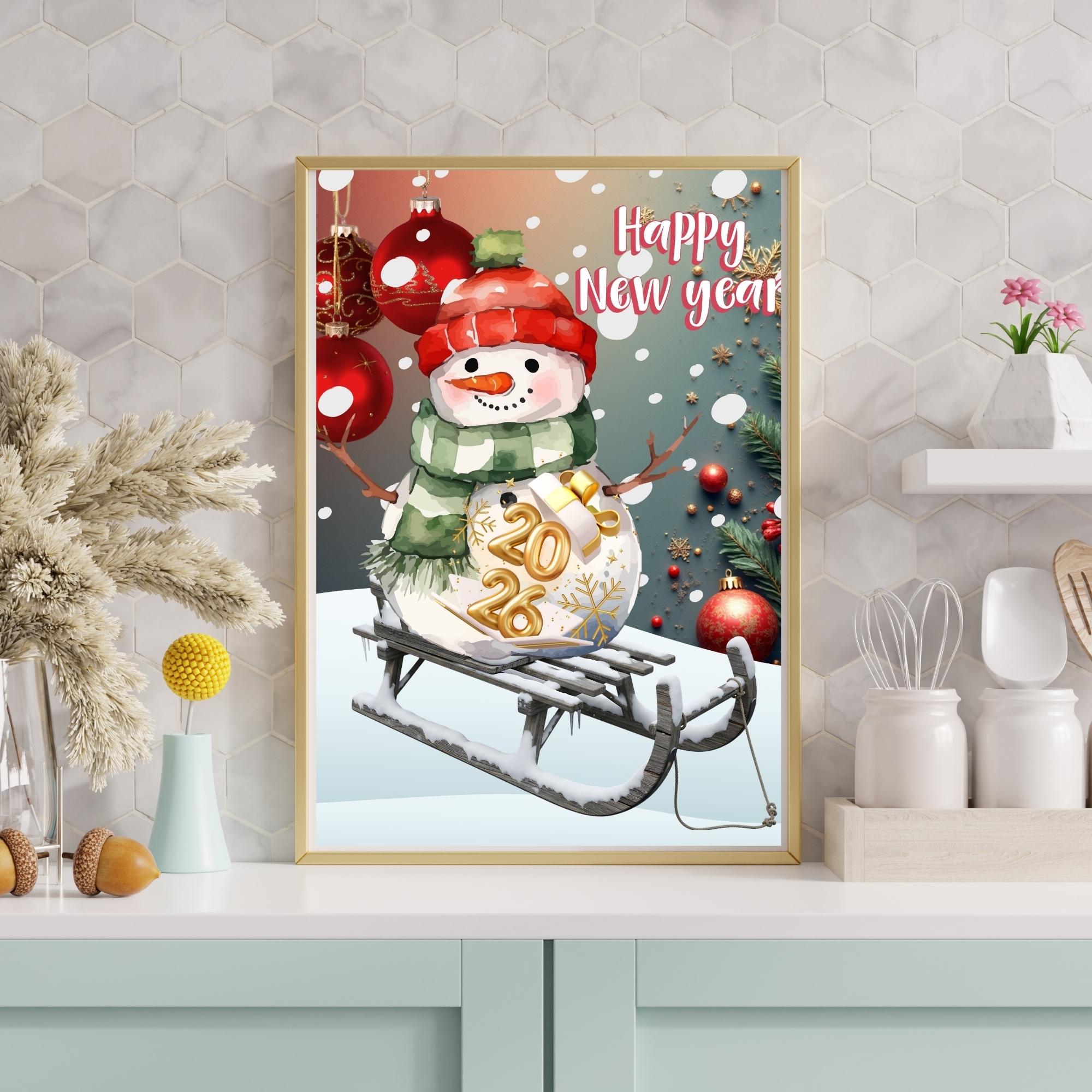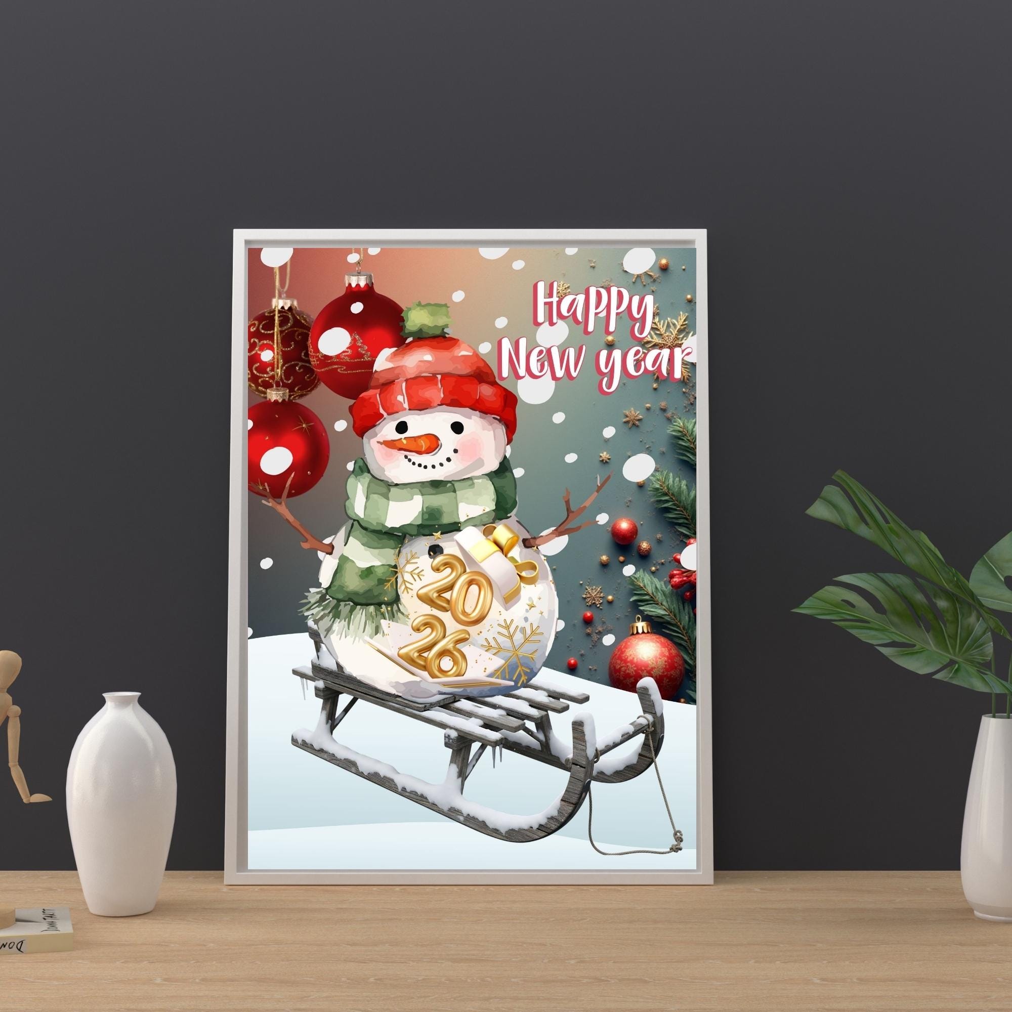 New Year 2026 Snowman Wall Art Printable Holiday Winter Digital Decor