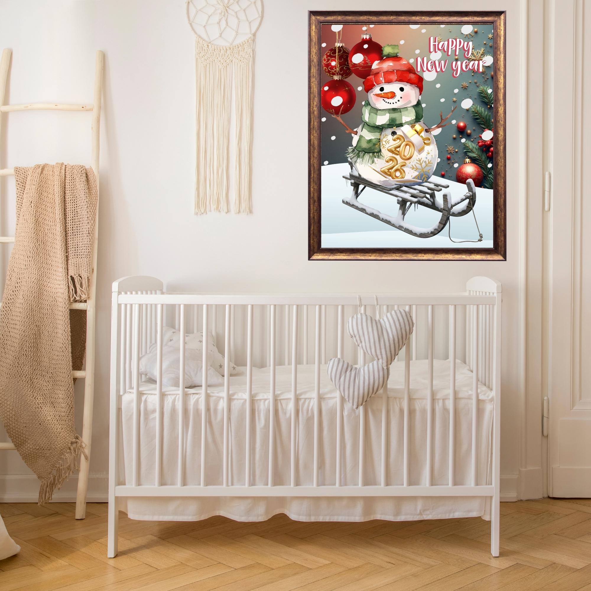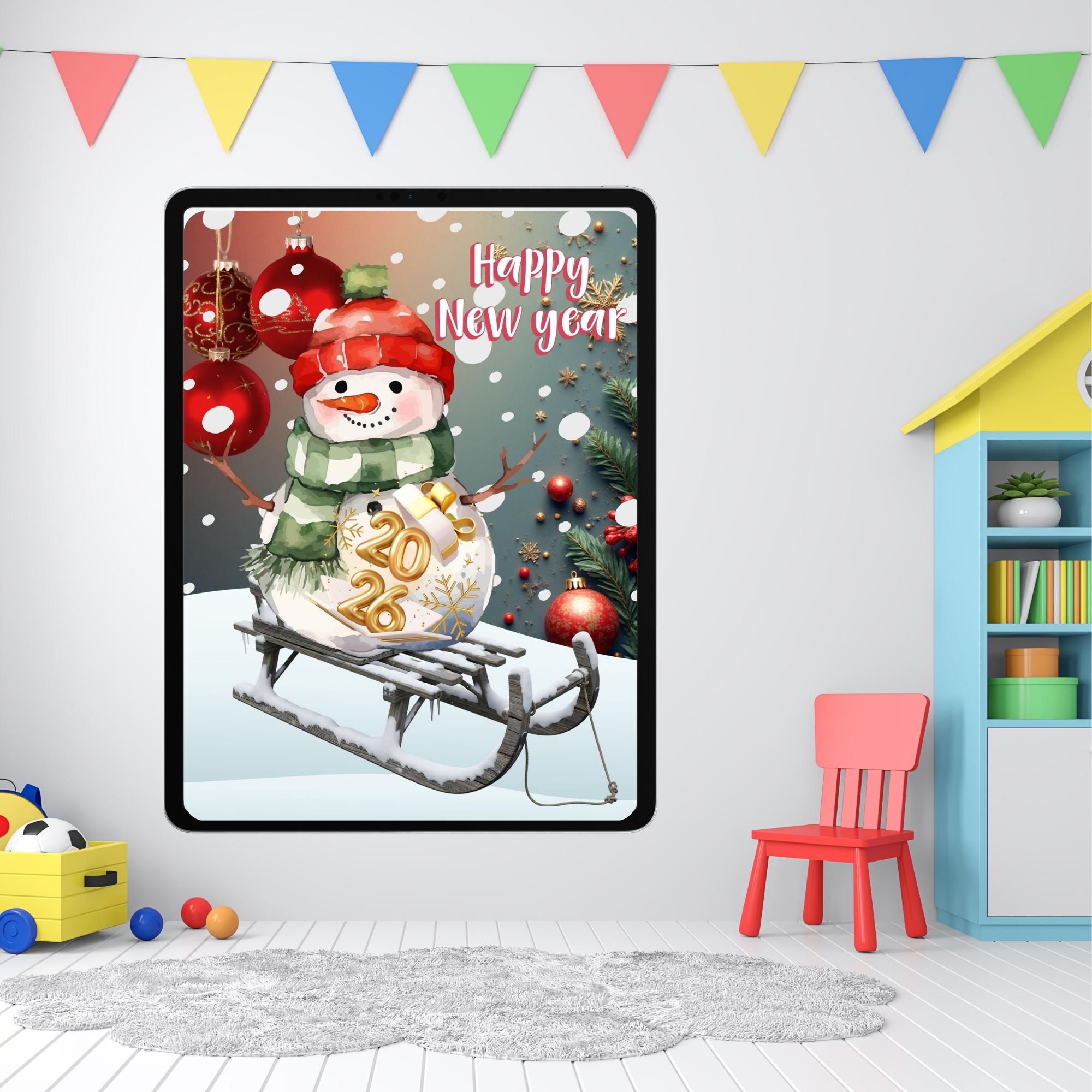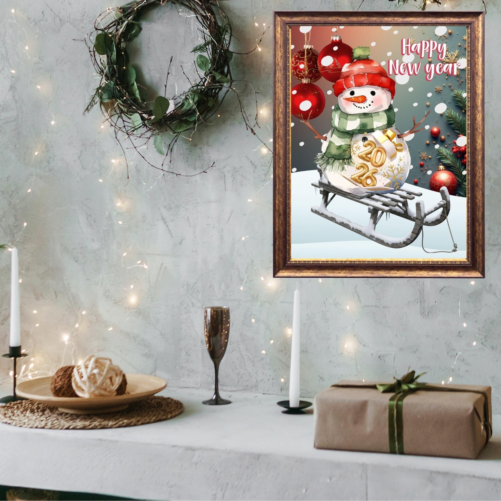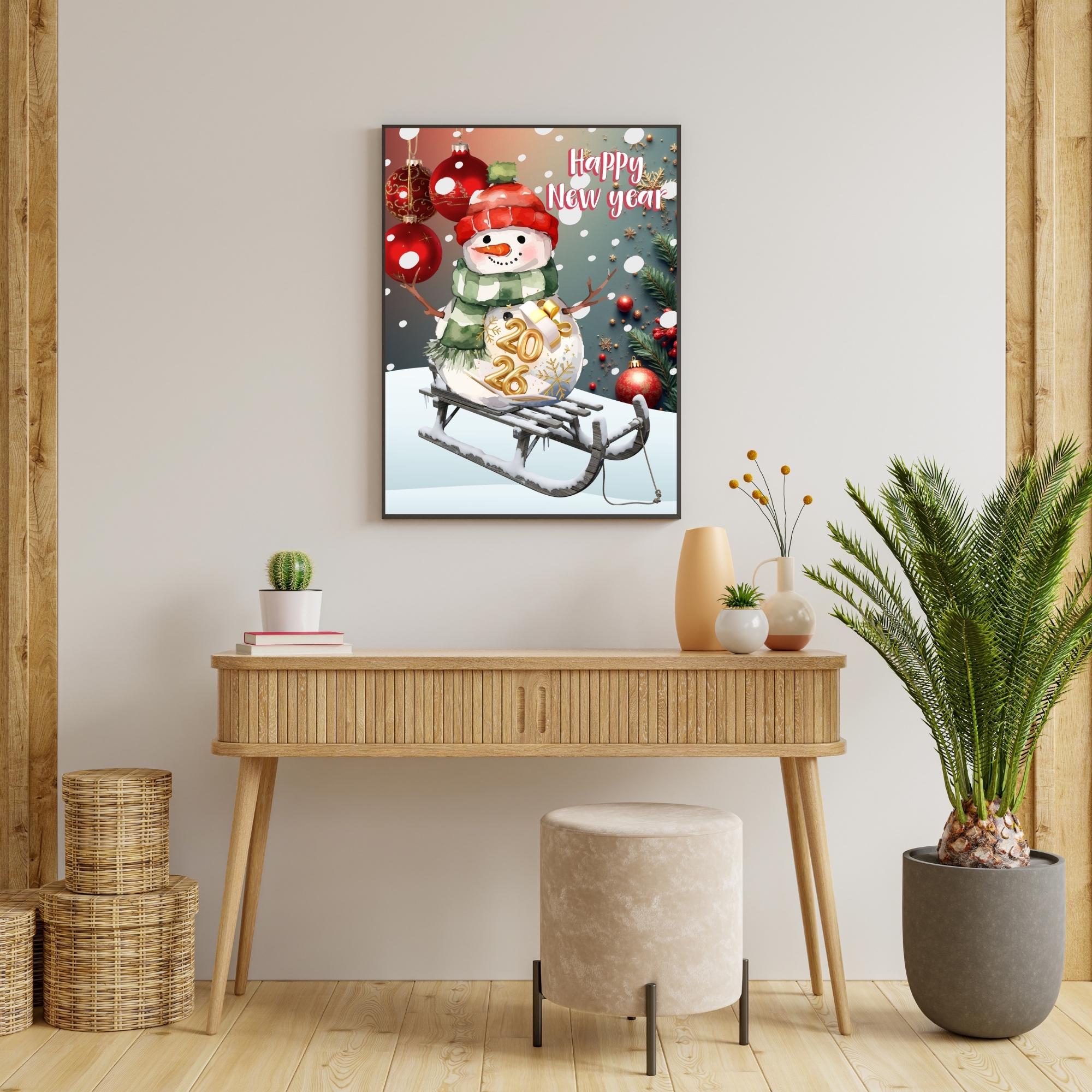 This festive New Year 2026 Snowman wall art is a print-ready, downloadable digital product that brings your uploaded artwork into your home. The snowman's warm smile, winter celebrations, and Christmas ornaments create a modern and fun decor. Use it anywhere—in the living room, a children's room, or as a new party decor—and instantly create a festive atmosphere.