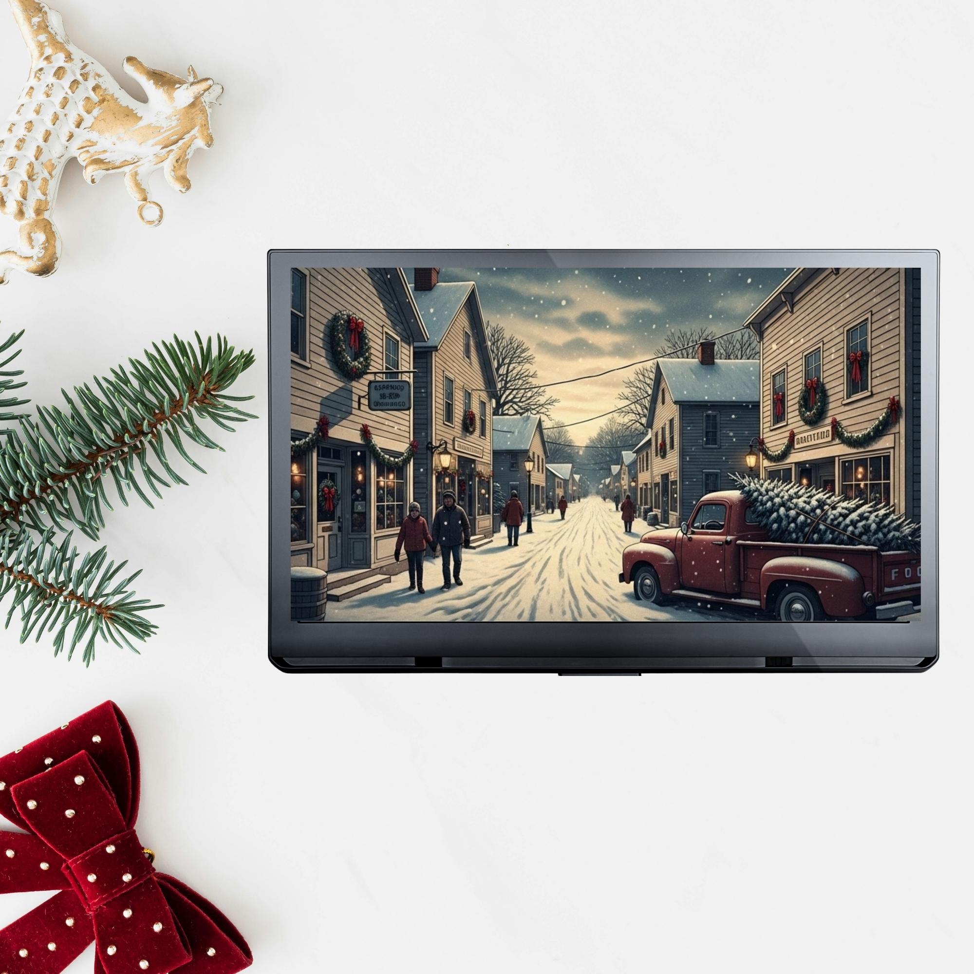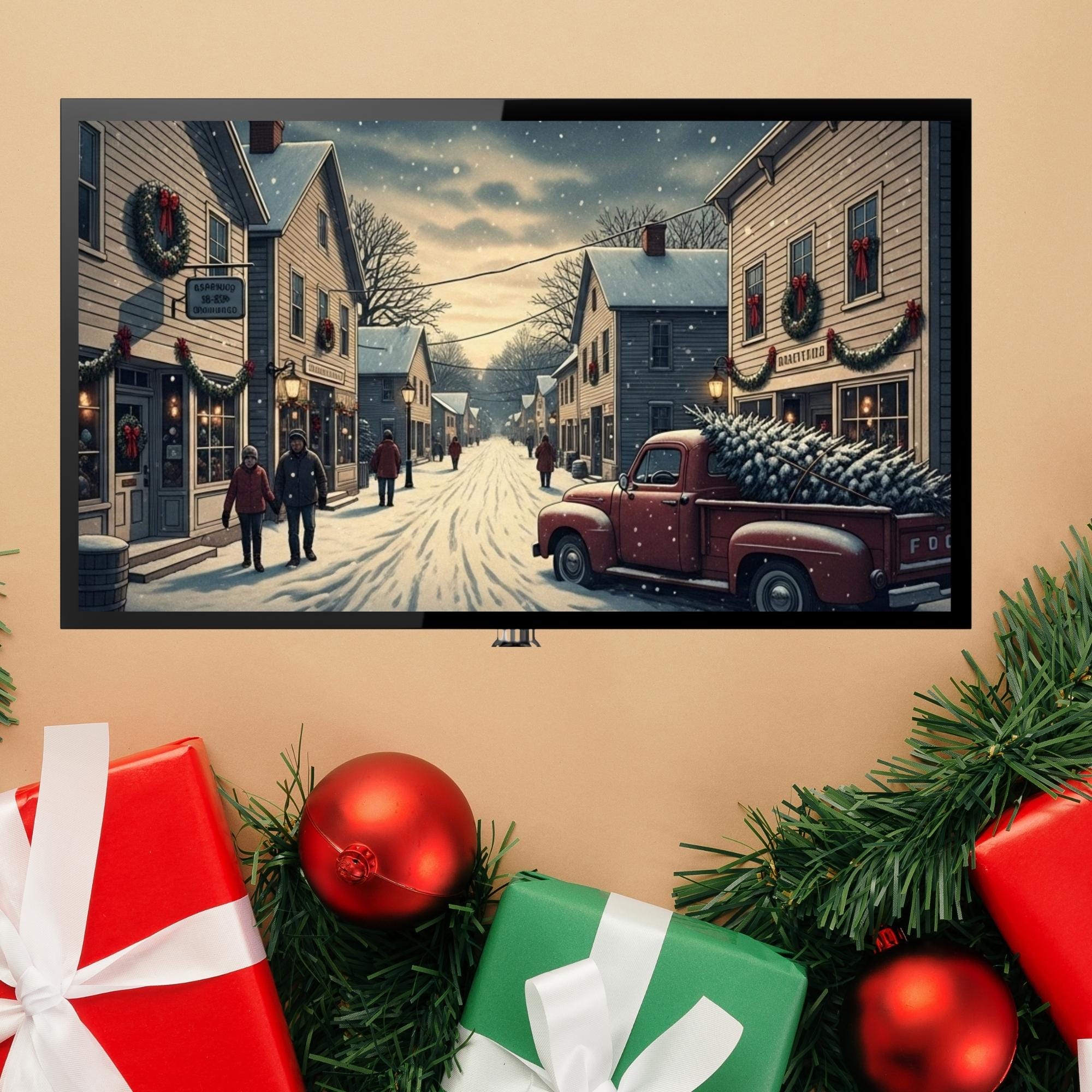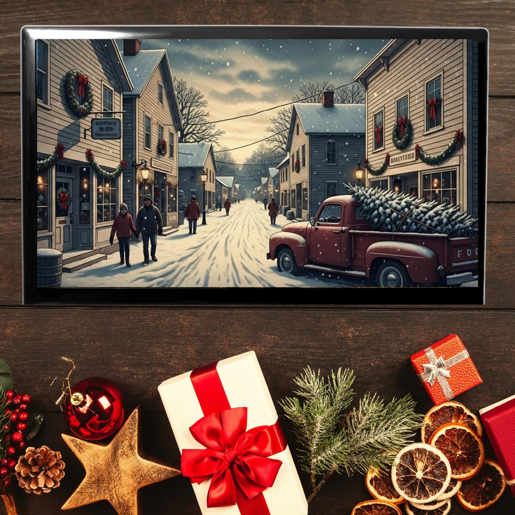 This charming vintage Christmas village artwork transforms your living space into a warm, nostalgic winter escape, perfect for anyone wanting to create a magical seasonal ambiance on their Samsung Frame TV. With softly falling snow, warmly lit storefronts and a classic red truck carrying a freshly cut tree, this vintage Christmas village scene adds depth, emotion and timeless holiday beauty to your décor. Designed as a high-resolution 3840x2160 px-300dpi digital download, it elevates your home instantly without adding physical clutter, making it an ideal choice for cozy living rooms, kitchens or welcoming entryways 🎄✨