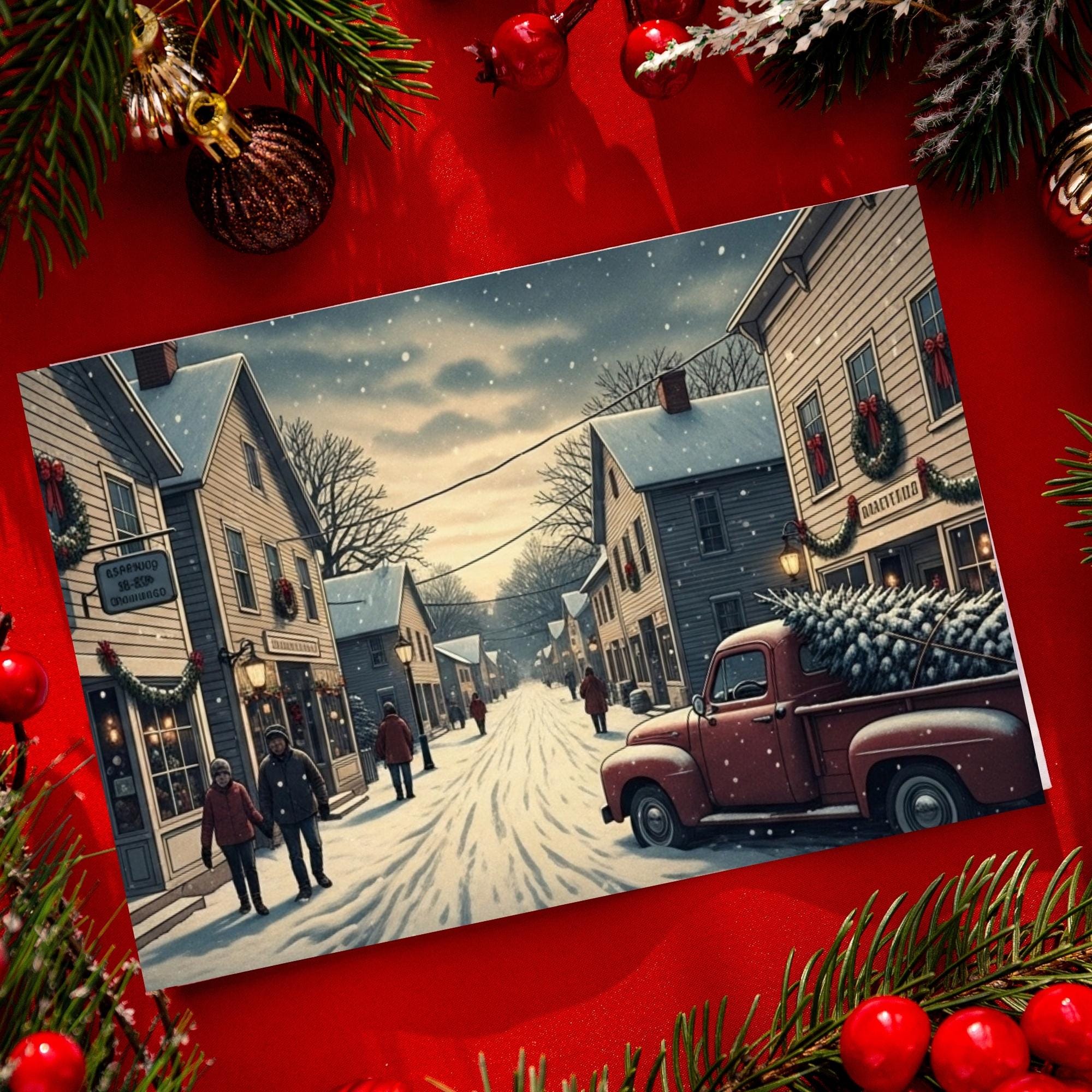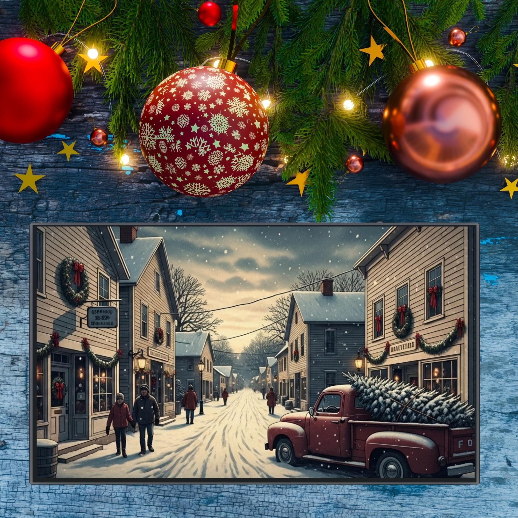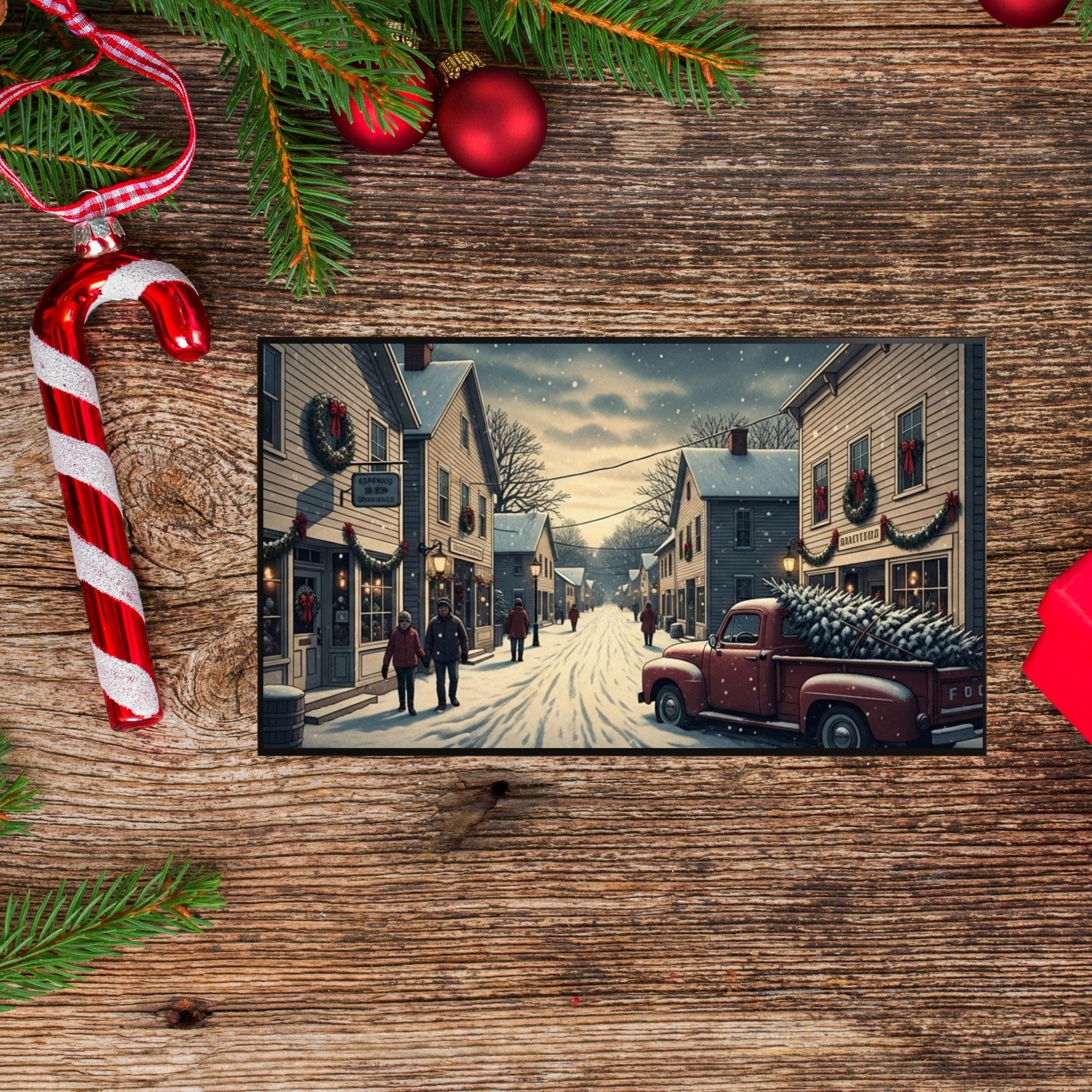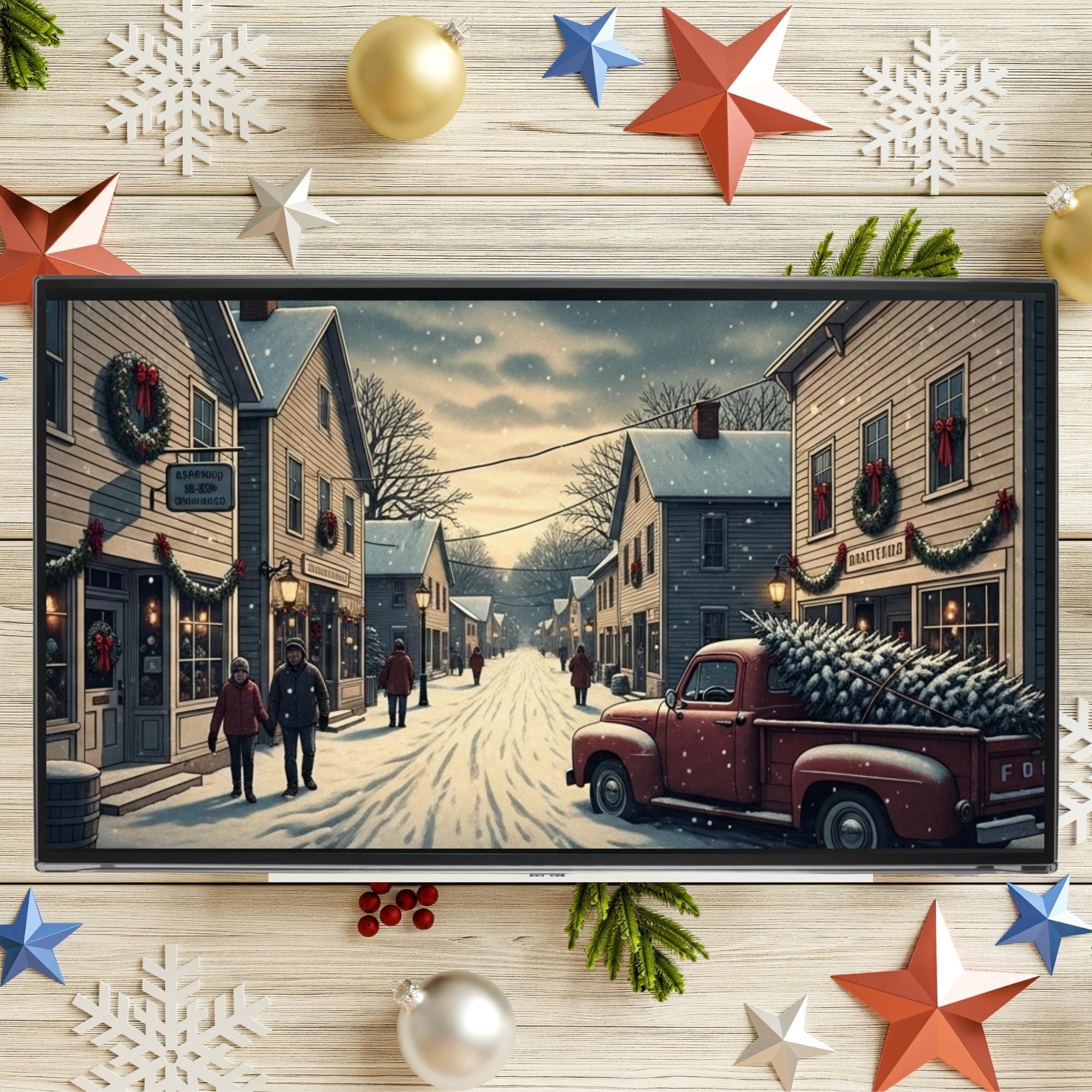 This charming vintage Christmas village artwork transforms your living space into a warm, nostalgic winter escape, perfect for anyone wanting to create a magical seasonal ambiance on their Samsung Frame TV. With softly falling snow, warmly lit storefronts and a classic red truck carrying a freshly cut tree, this vintage Christmas village scene adds depth, emotion and timeless holiday beauty to your décor. Designed as a high-resolution 3840x2160 px-300dpi digital download, it elevates your home instantly without adding physical clutter, making it an ideal choice for cozy living rooms, kitchens or welcoming entryways 🎄✨