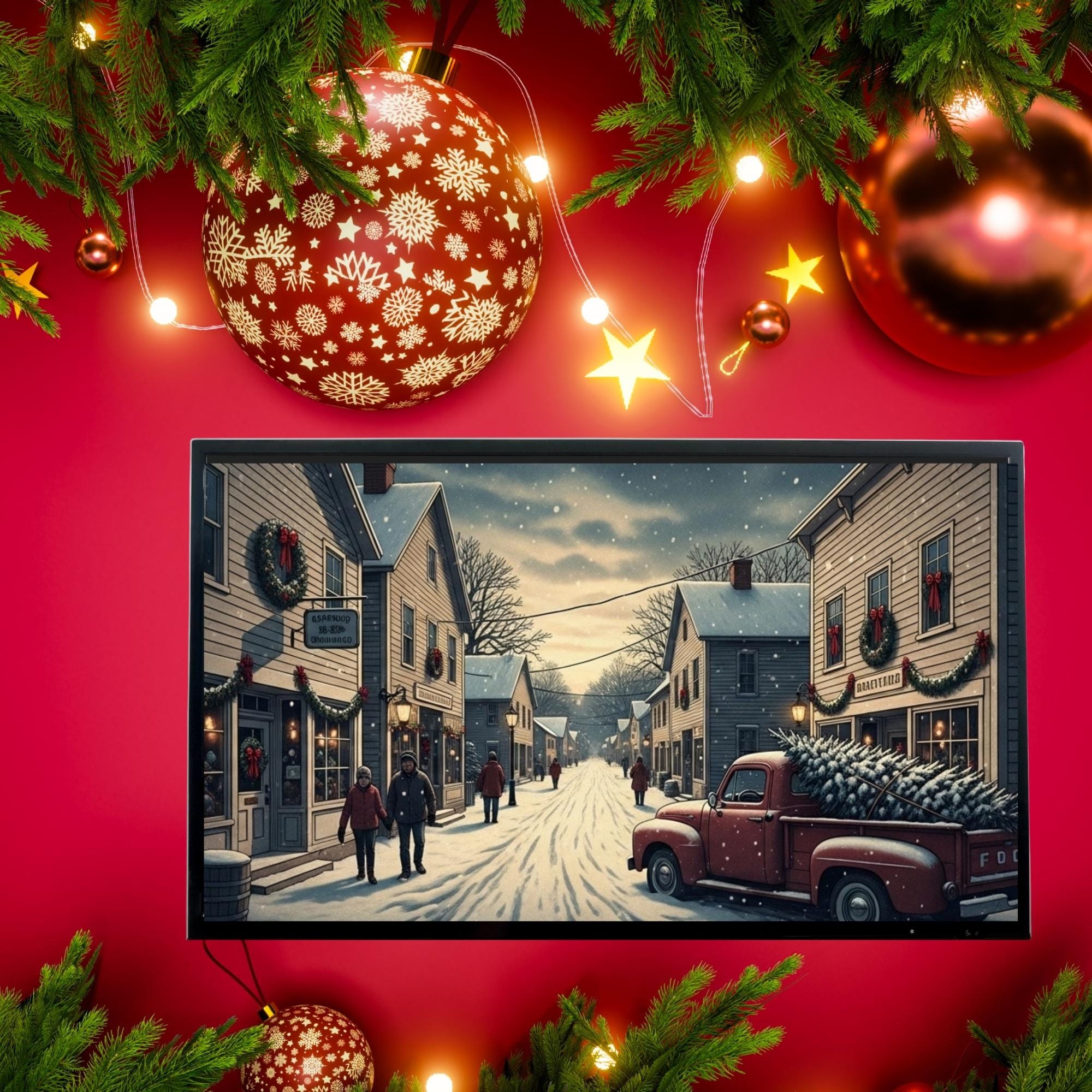 Snowy frame TV art, vintage Christmas village scene with red truck, 4K digital download