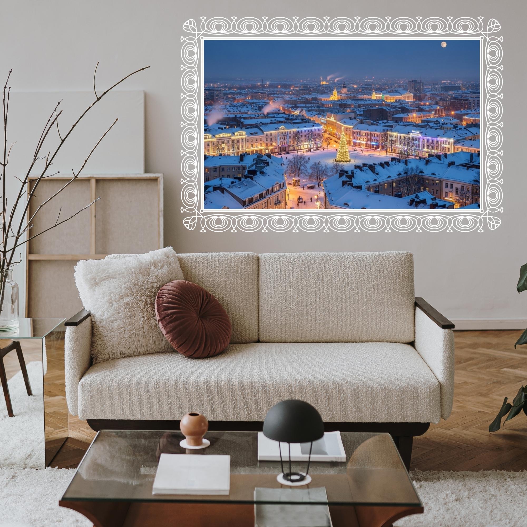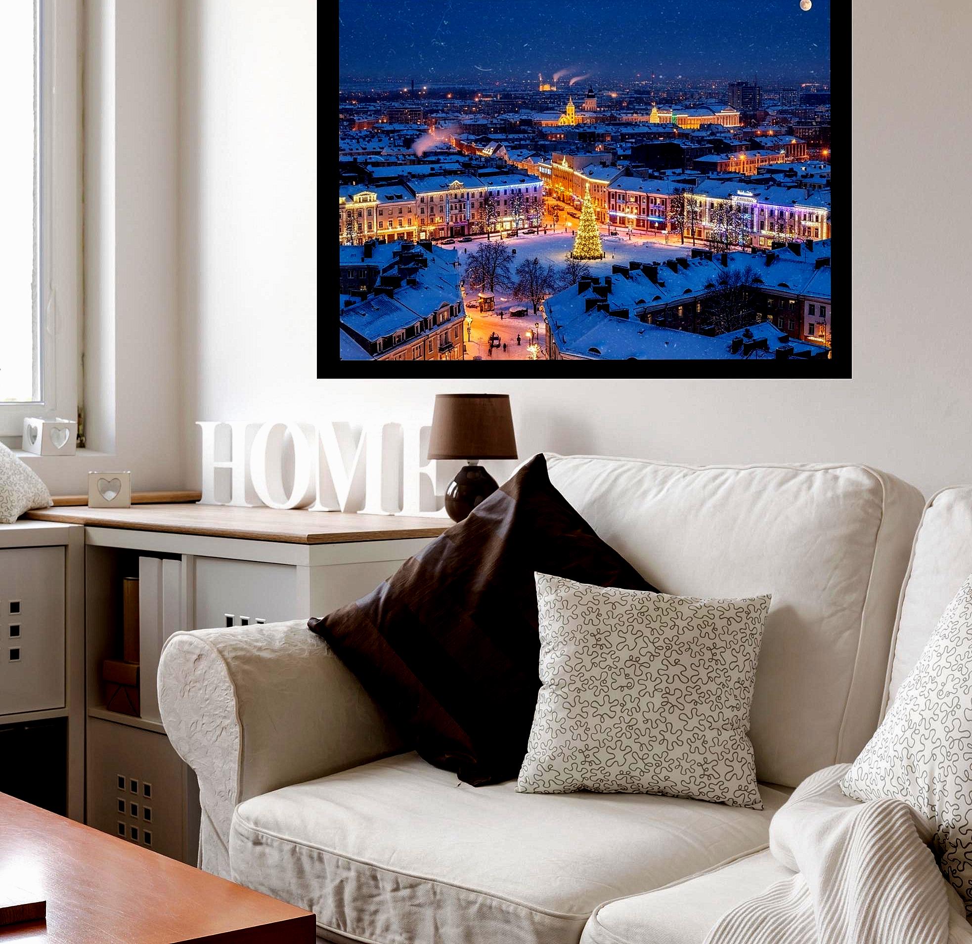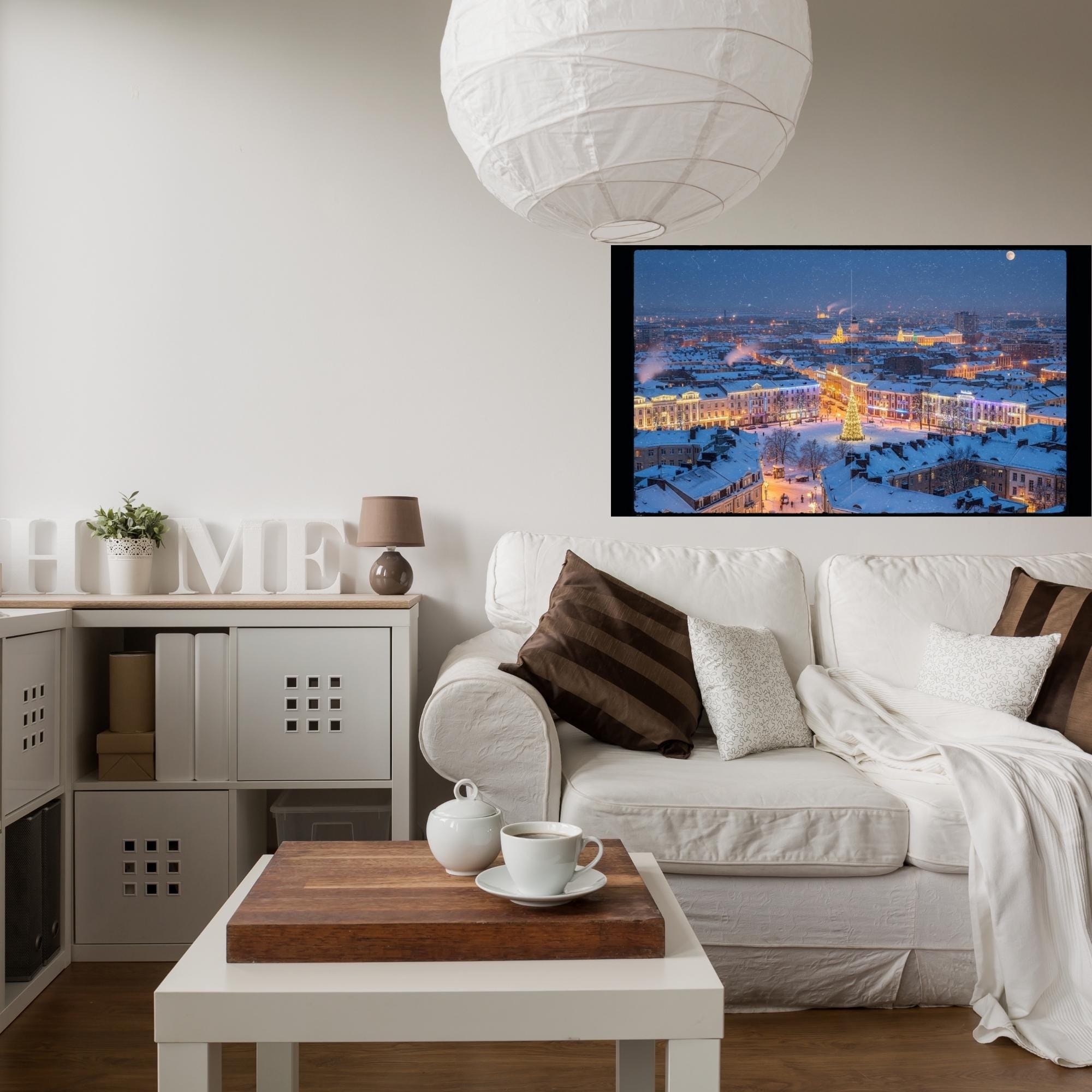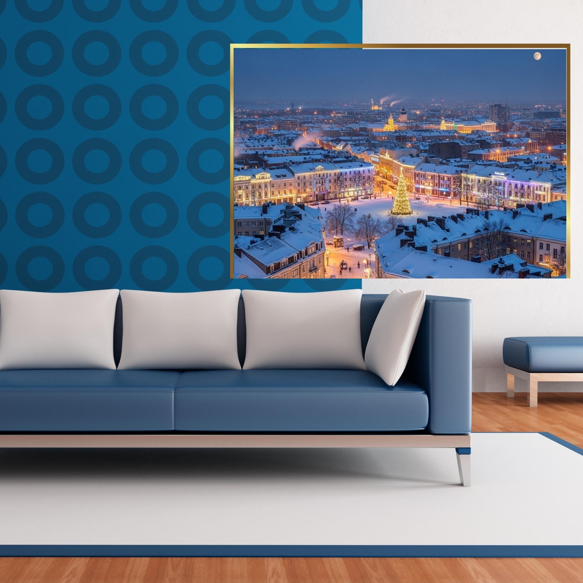 Transform your home into a warm and festive winter haven with this Christmas Cityscape TV Art. Featuring a beautifully illuminated town square, a glowing Christmas tree, snow-covered rooftops, and charming historic buildings, this artwork brings a magical holiday atmosphere to any living space.