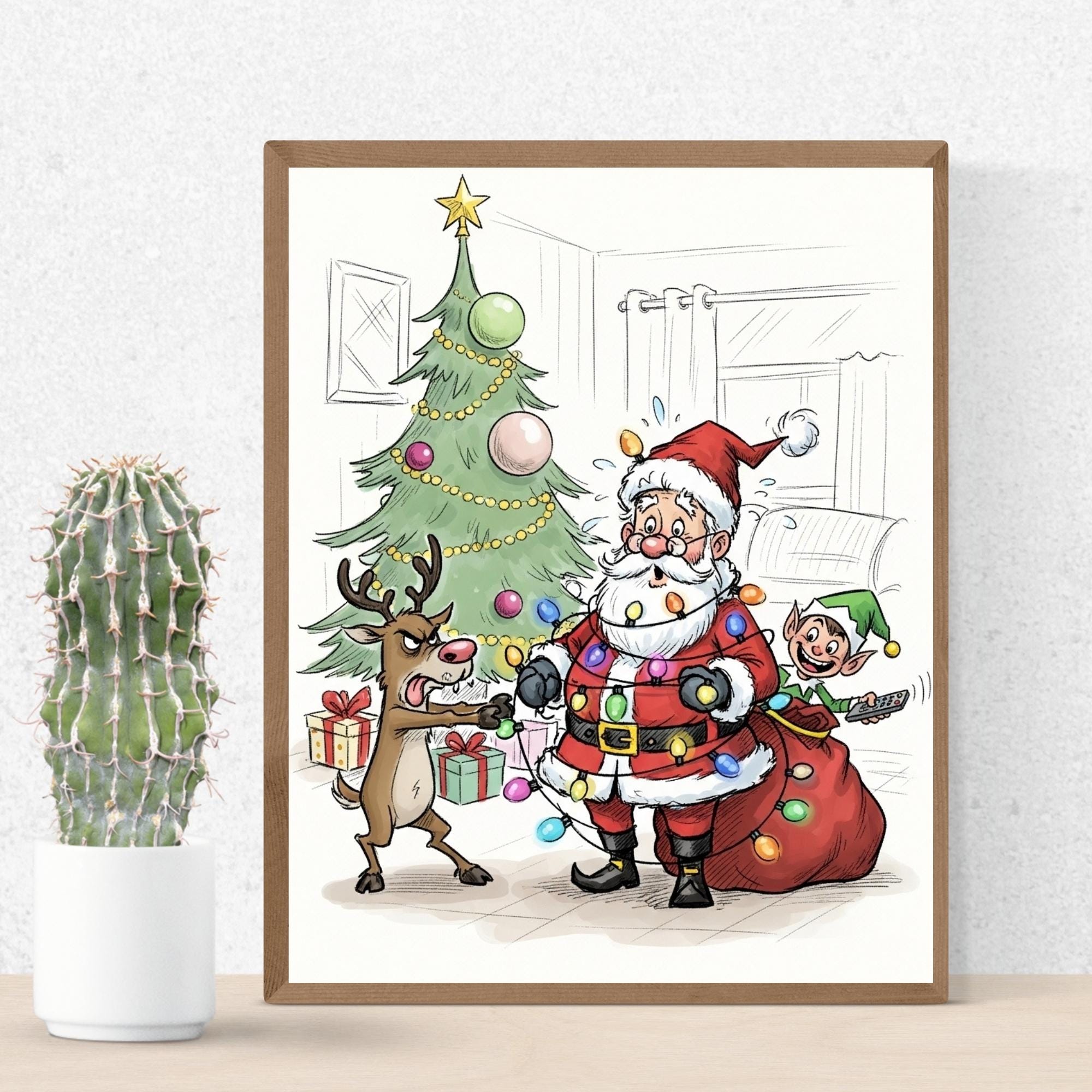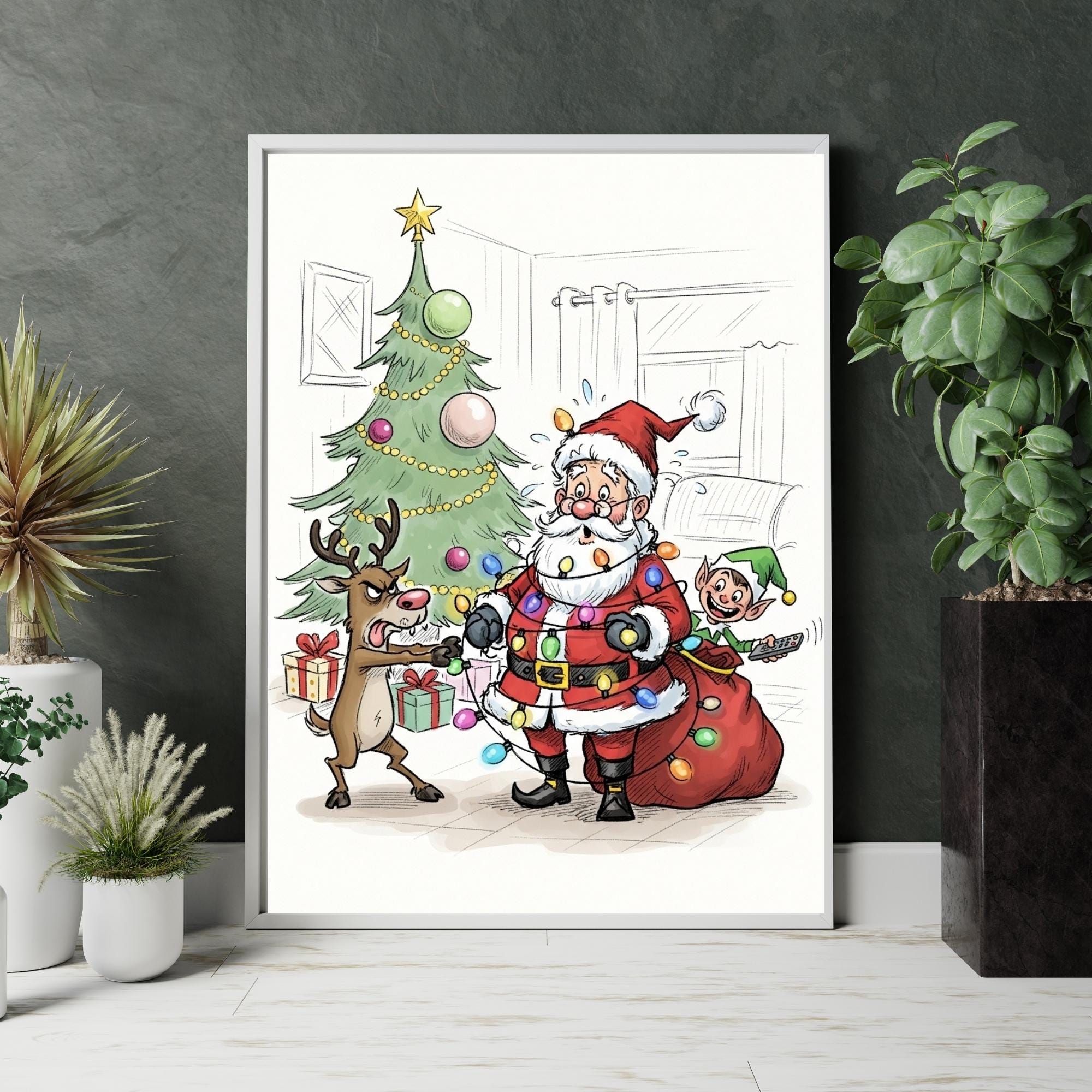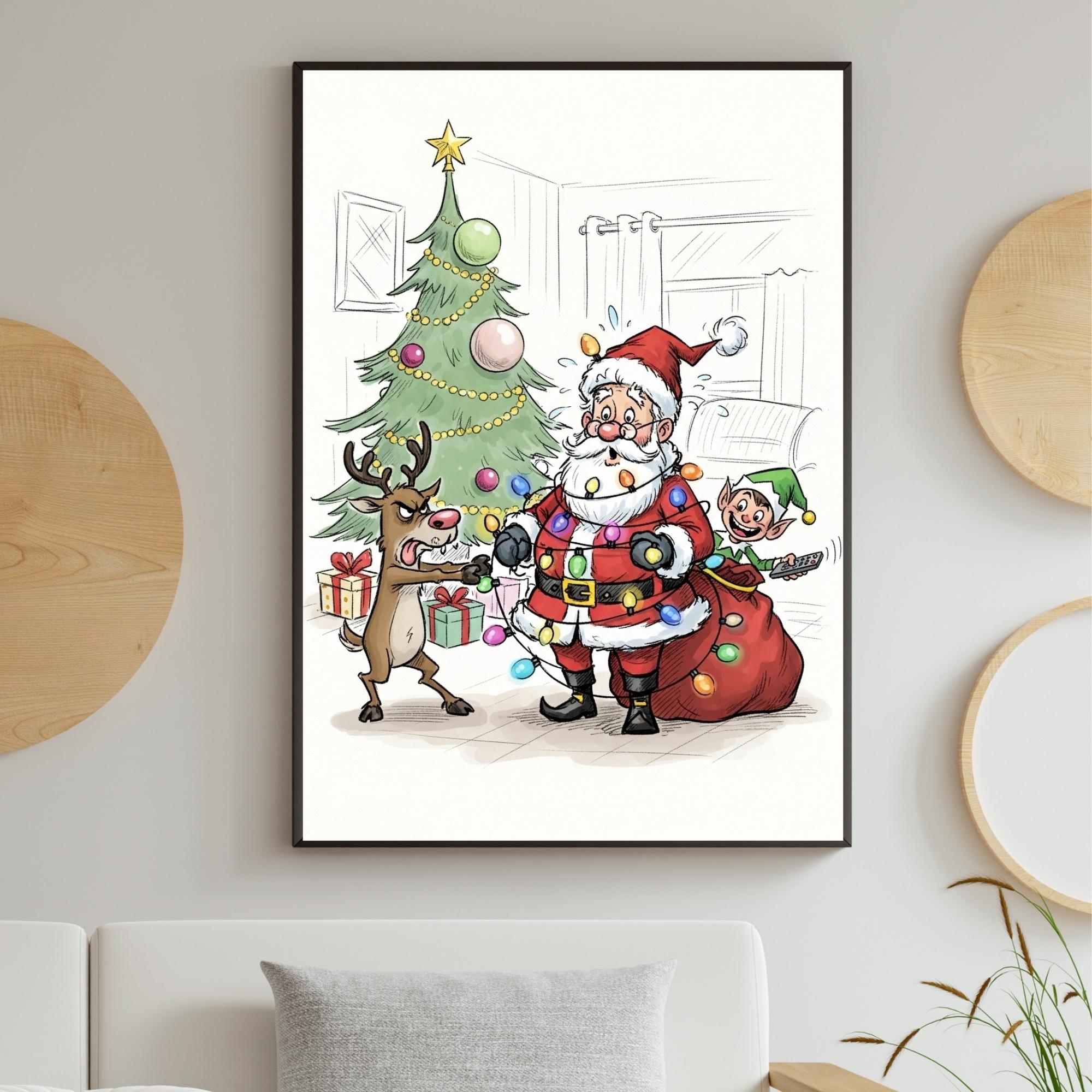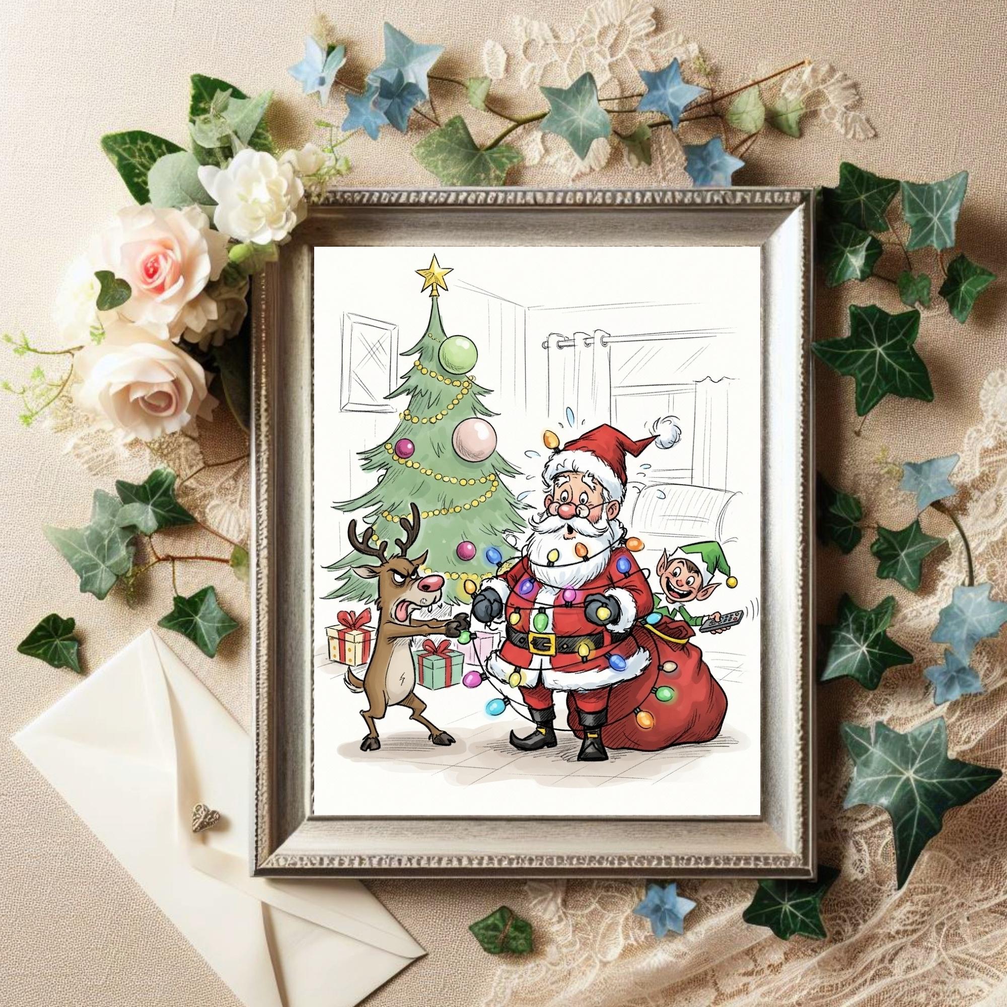This vibrant and humorous Christmas illustration captures Santa tangled in lights, a grumpy Rudolph, and a mischievous elf with a remote control — all in one chaotic, festive scene. Delivered as 5 high-resolution printable PDF files, this set is perfect for bringing laughter and charm to your seasonal decorations.