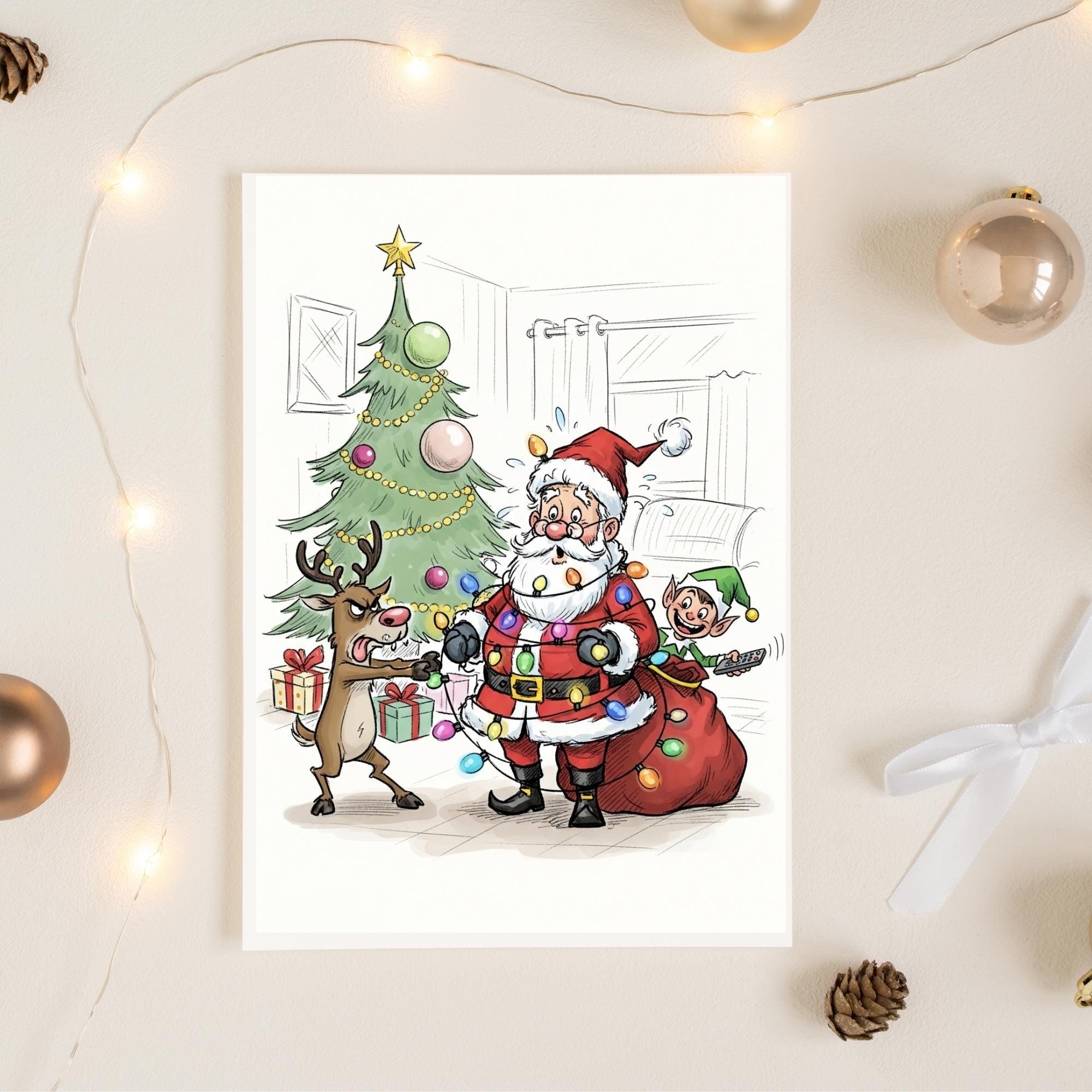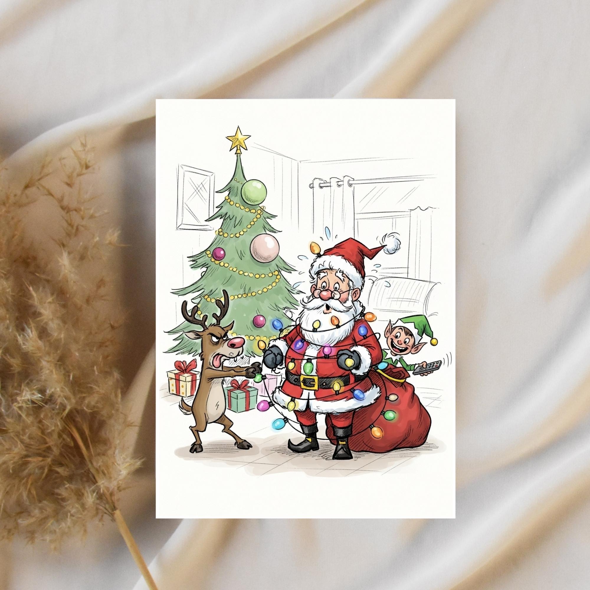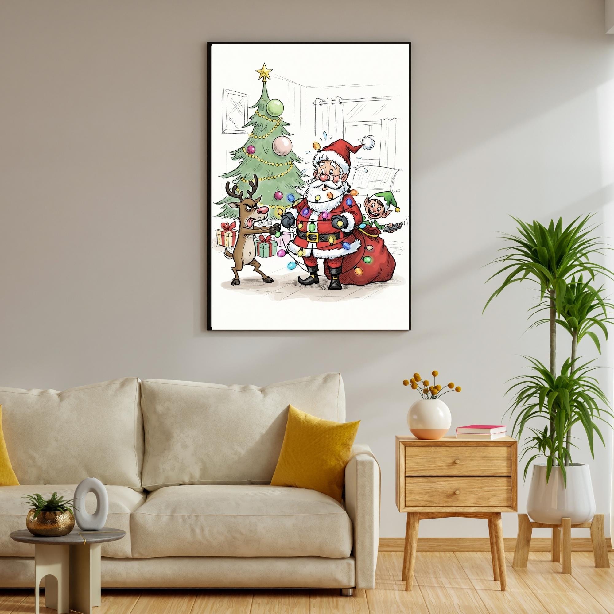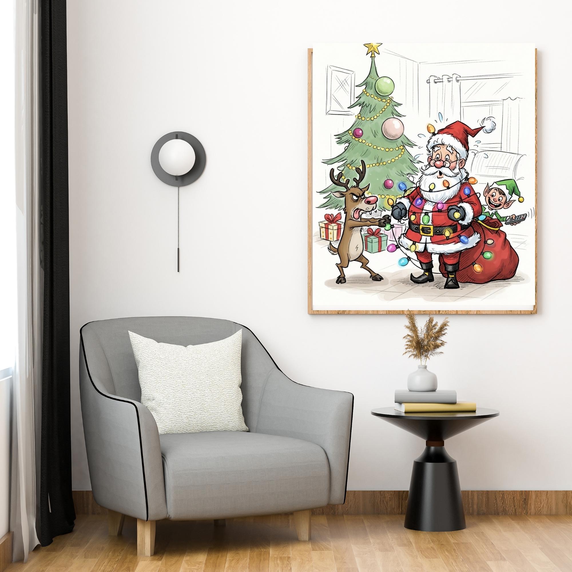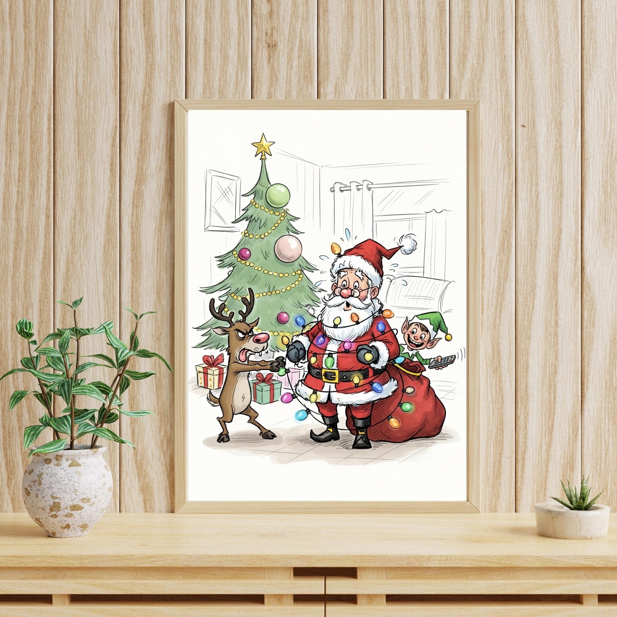 This vibrant and humorous Christmas illustration captures Santa tangled in lights, a grumpy Rudolph, and a mischievous elf with a remote control — all in one chaotic, festive scene. Delivered as 5 high-resolution printable PDF files, this set is perfect for bringing laughter and charm to your seasonal decorations.